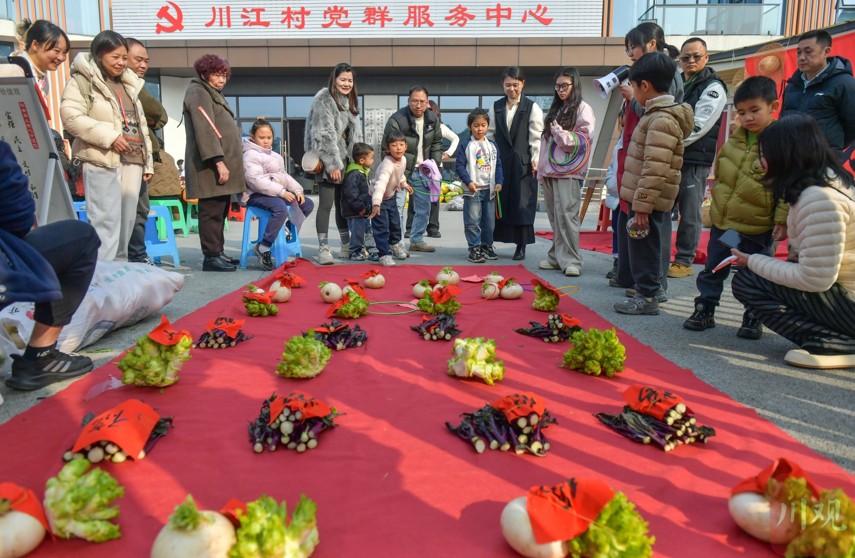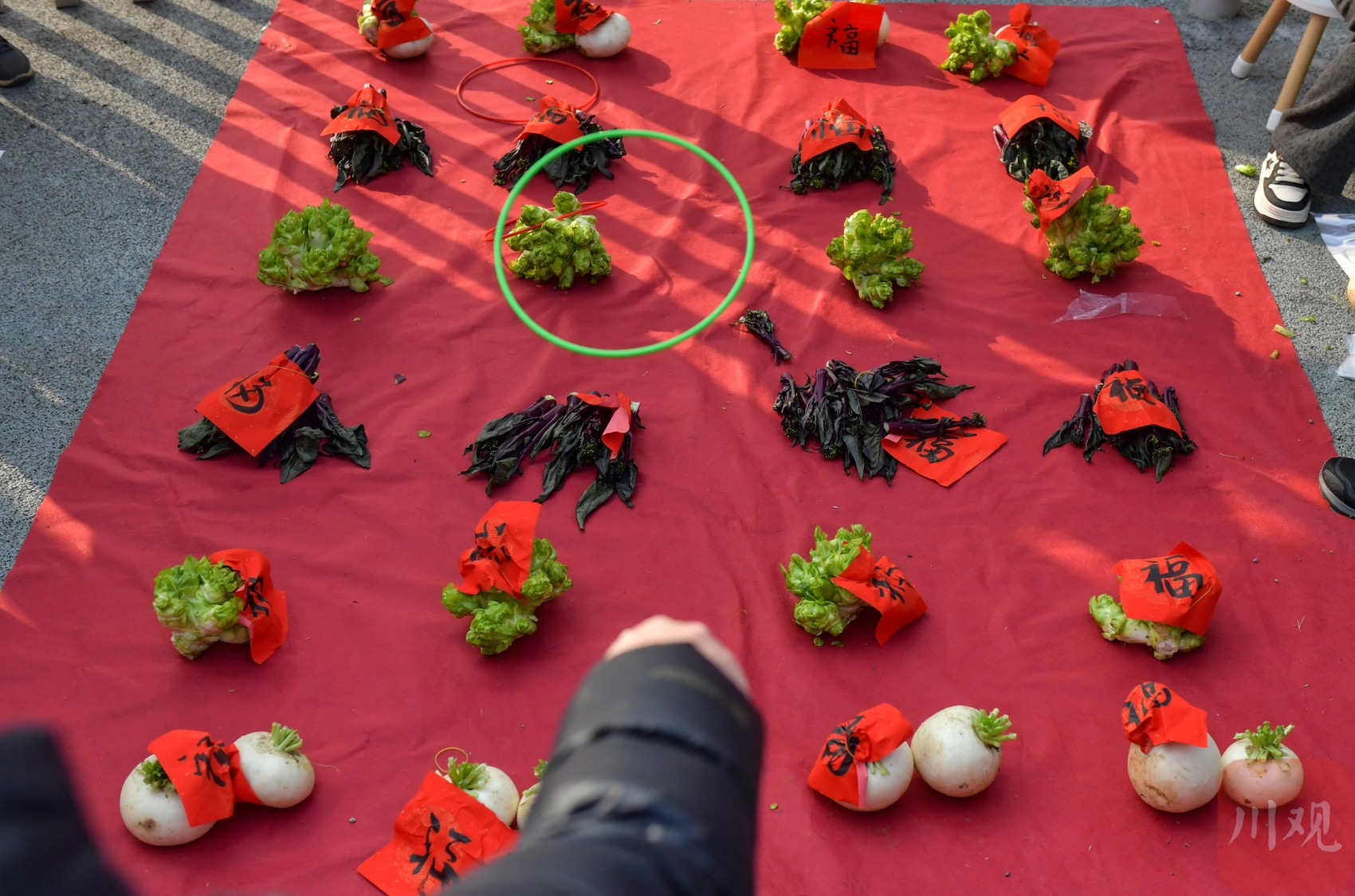 2026年1月17日,在成都市双流区黄龙溪镇川江村,游客参与“蔬菜套圈”趣味活动。