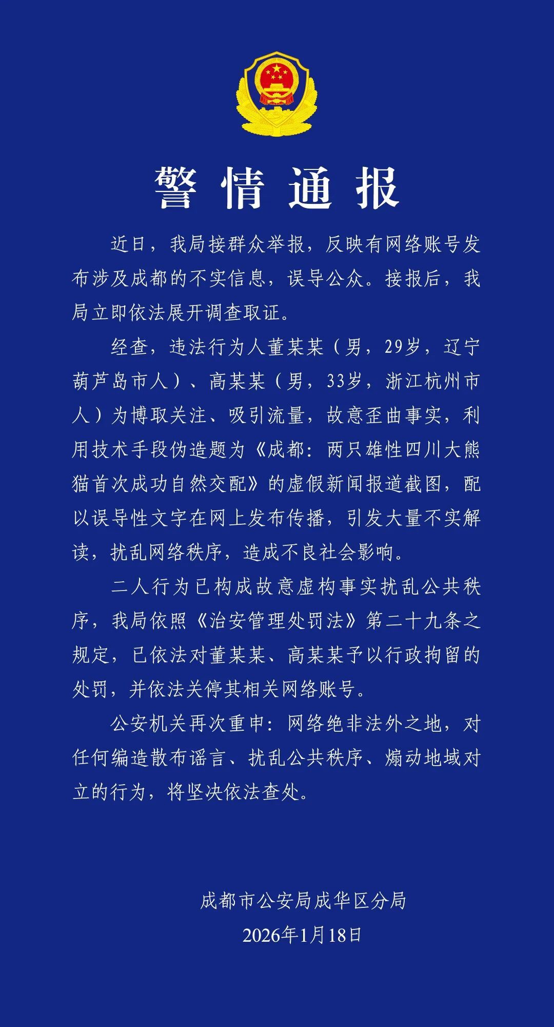 成都公安发布通报:为博流量,二人炮制熊猫虚假新闻,依法予以行政拘留