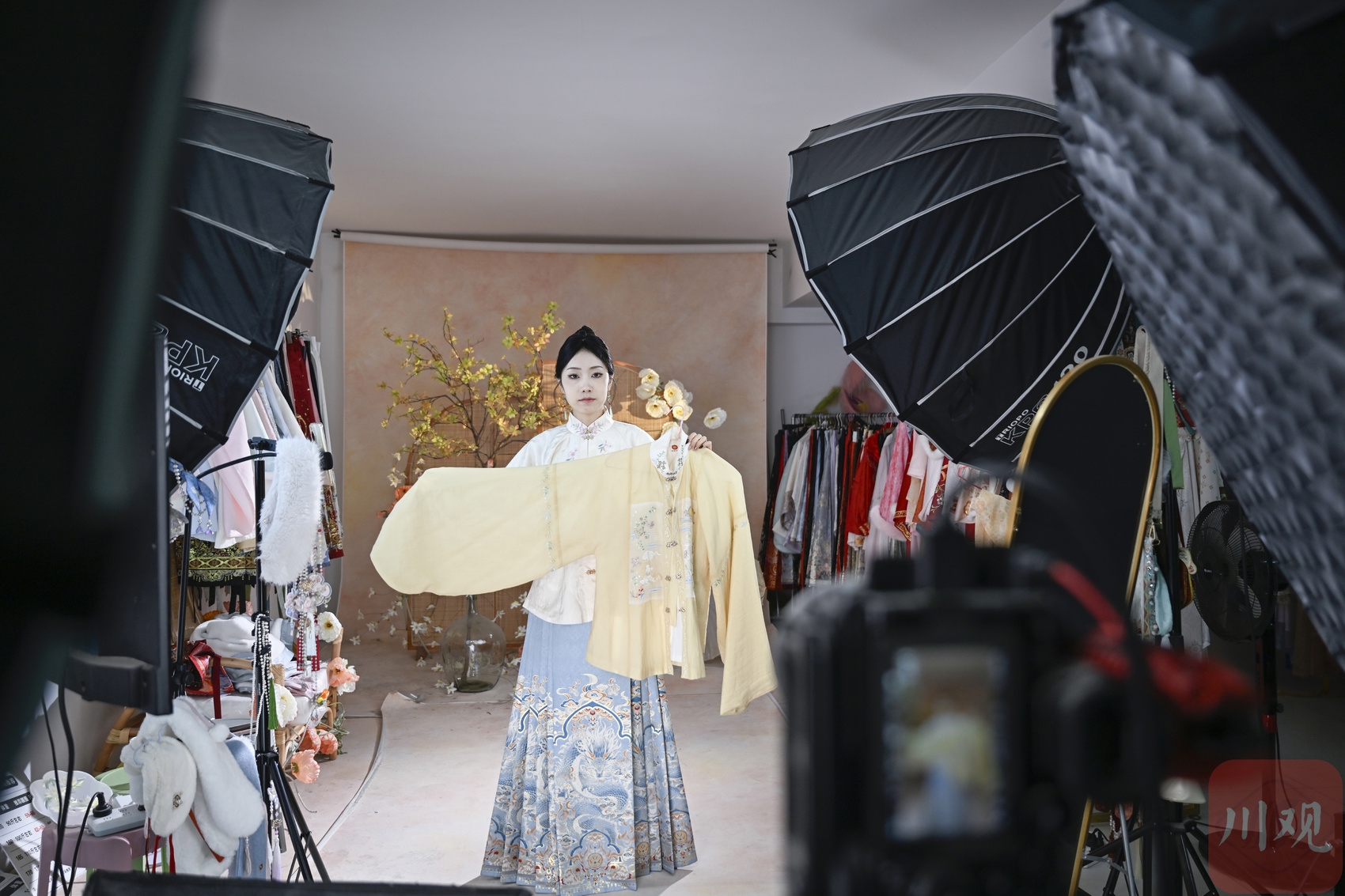 1月10日,汉服直播间内,主播在镜头前展示今年款的汉服。