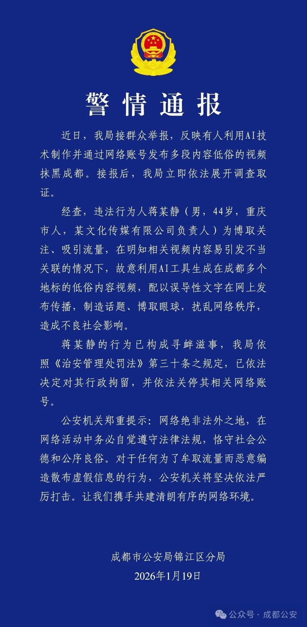 2026年1月19日,成都市公安局锦江区分局发布警情通报: