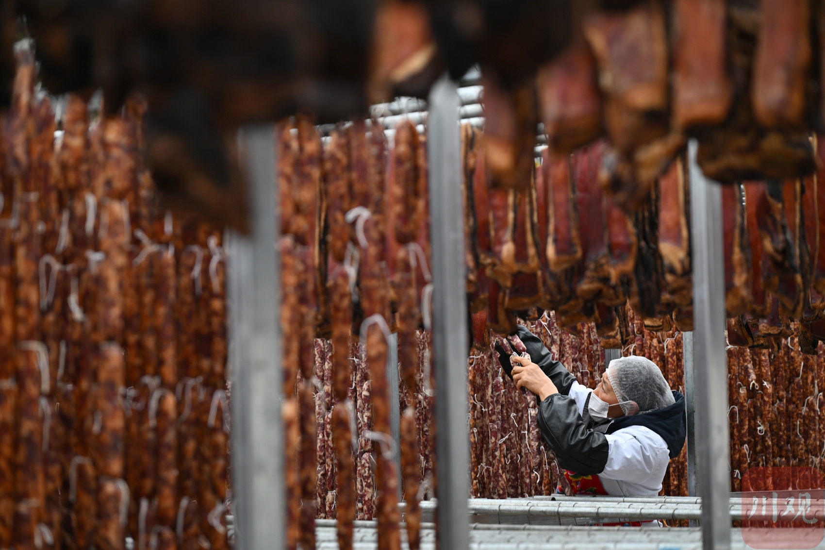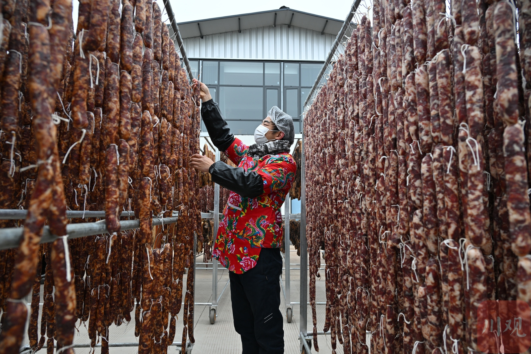 1月20日,大寒,位于德阳市旌阳区新中镇桂花村的四川妈仔食品有限责任公司晒场上,一排排色泽诱人的腊肠、腊肉、腊排整齐晾晒,工人们忙着翻晒、整理,一派热火朝天的生产景象。这家食品企业,正开足马力赶制春节订单。
