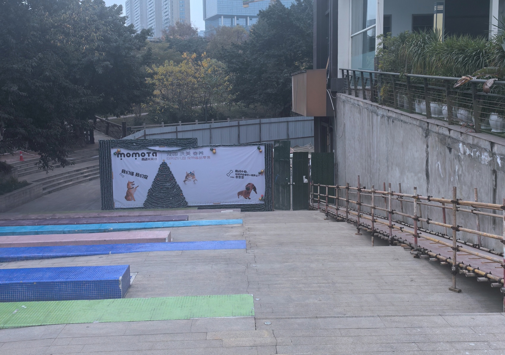金房大榕湾小区沿河而建,由多栋高层住宅组成。网友反映的“宠物一条街”项目位于小区6号楼底层商铺区域。6号楼一楼是商铺,楼上则都是公寓住房,该处商铺沿河分布,记者看到,有近10处店面处于打围状态。其中,拐角两处店面围挡上明确标出商家的名字及未来的经营业态——宠咖、洗美、寄养,宠物日托幼儿园、宠物商品零售。