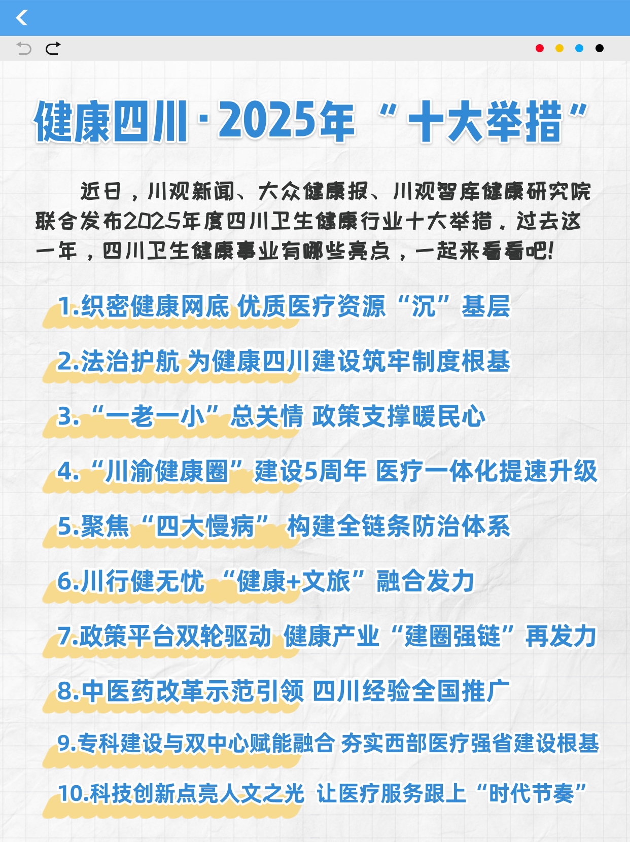 1月21日,2026年四川省卫生健康工作会议期间,省卫生健康委公布2025年度健康四川“十大举措”的落地成效。过去一年,从结婚生育到养老就医,从城市社区到偏远乡村,四川人的健康保障网越织越密,诸多民生利好政策落地生根。