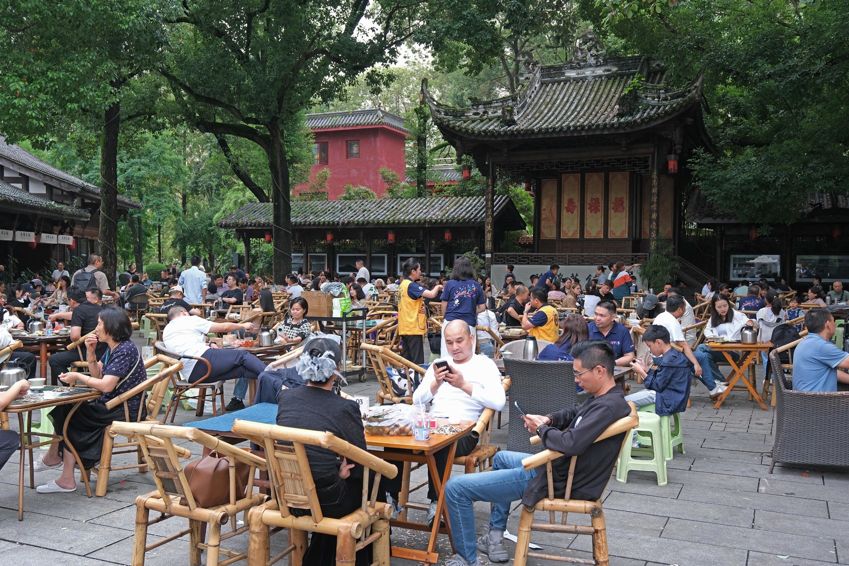 游客在位于成都市青羊区的大旗茶馆拍照打卡。新华社记者 董小红 摄