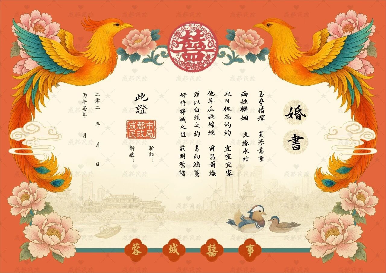 成都2026年继续免费发放婚书 新版“蓉城囍事”主题婚书春节上线