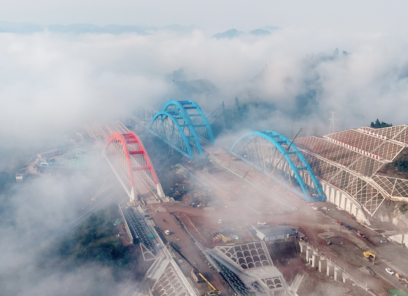 这座大桥的意义远不止于其本身。它所在的位置,正是国家“八纵八横”高铁网中两条干线——时速350公里的西渝高铁与成达万高铁的交会区域。现场,西渝高铁的三座蓝色拱桥与一旁成达万高铁的红色拱桥并肩而立,形成“四桥并行”的壮观场面。