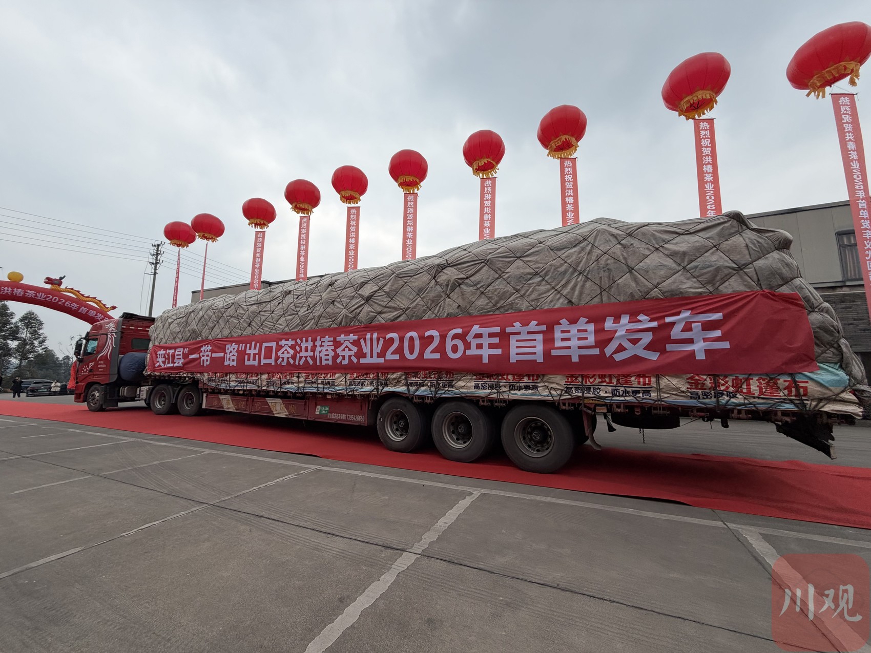 1月22日,挂有“夹江县‘一带一路’出口茶2026首单发车”红色条幅的大型货车从四川洪椿茶业有限公司驶出 杨艺茂 摄