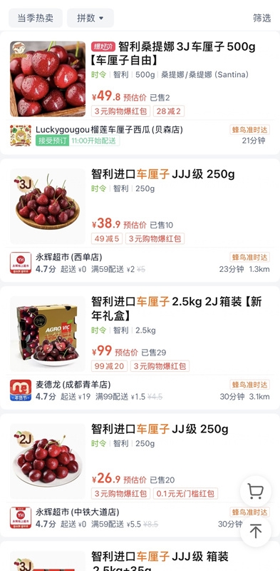 视线转向超市。生鲜商超围绕车厘子的竞争依旧激烈,甚至掀起了百元以内的价格混战。盒马鲜生推出限时活动:5斤装2J智利车厘子礼盒仅售99元,抖音上还能减2元;麦德龙也将同款单品价格下调至99元,页面显示该商品原价119元。记者打开外卖平台查询发现,车厘子货源充足,暂未出现“缺货”等提示。