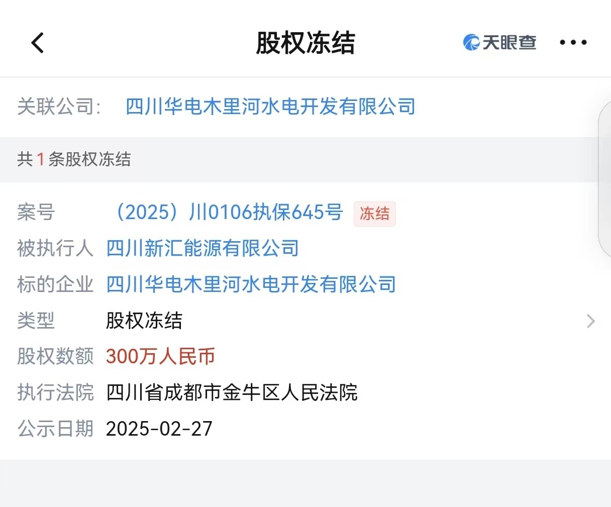 天眼查显示,四川新汇能源有限公司300万元股权数额被冻结。