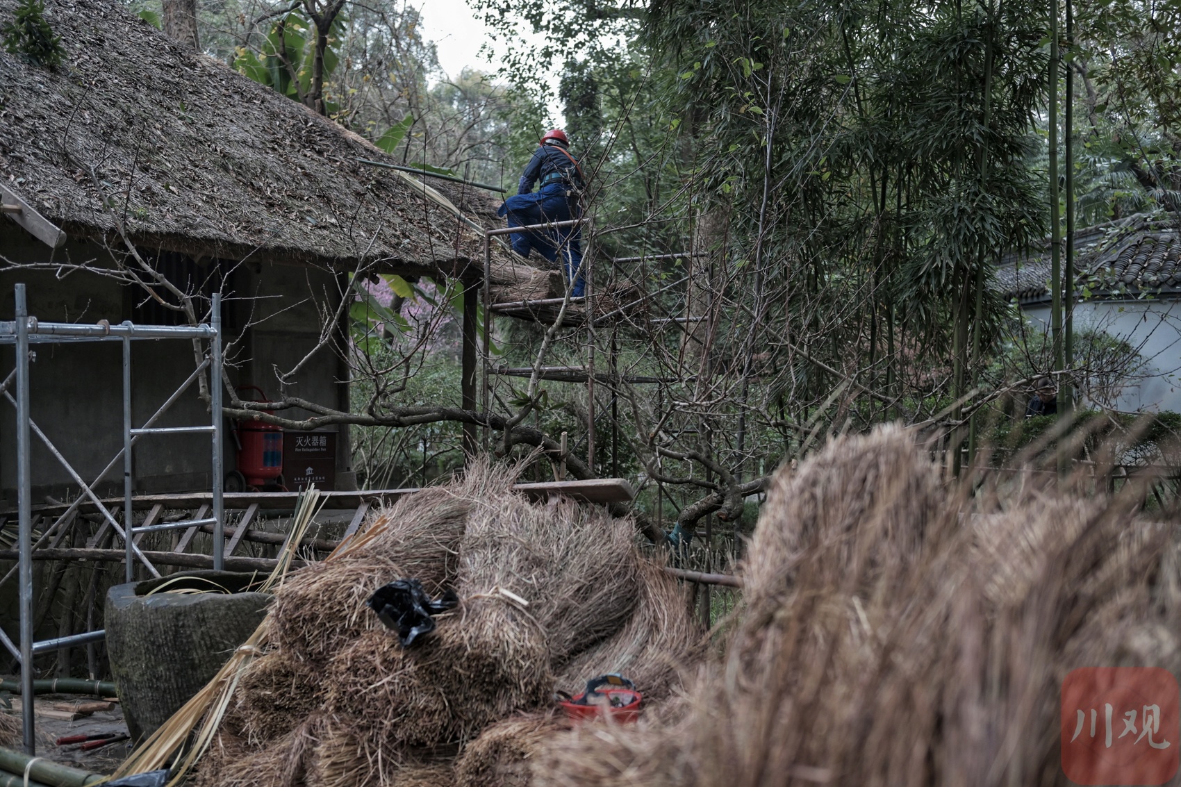 1月23日,成都杜甫草堂博物馆的茅屋旁,几名工人正使用篾刀、梳板与铡刀等传统工具,对屋顶进行修缮。