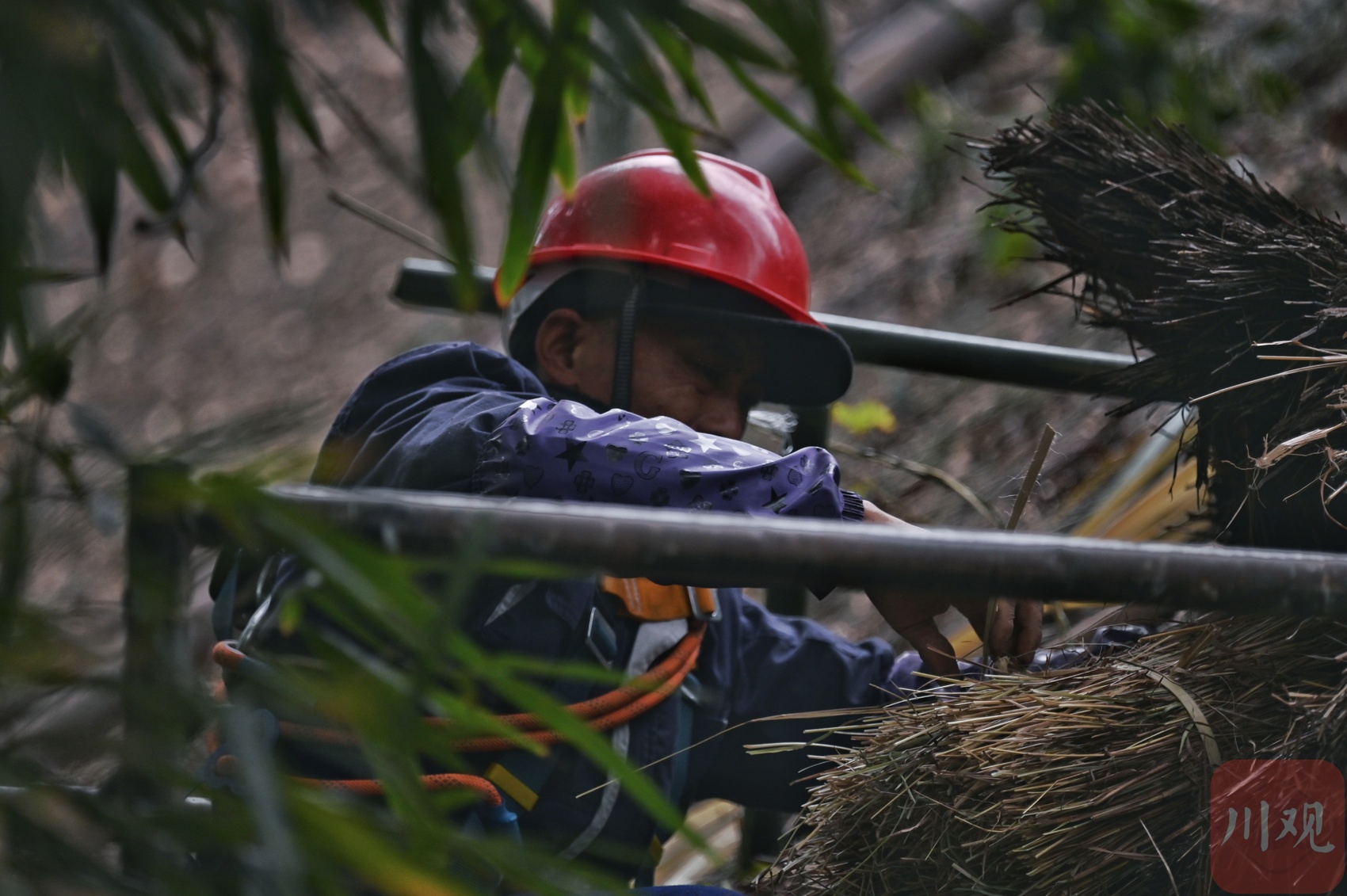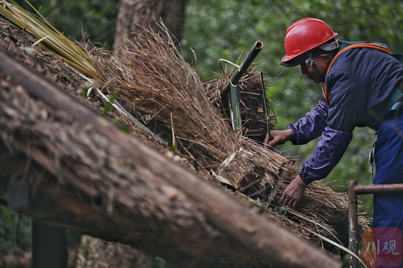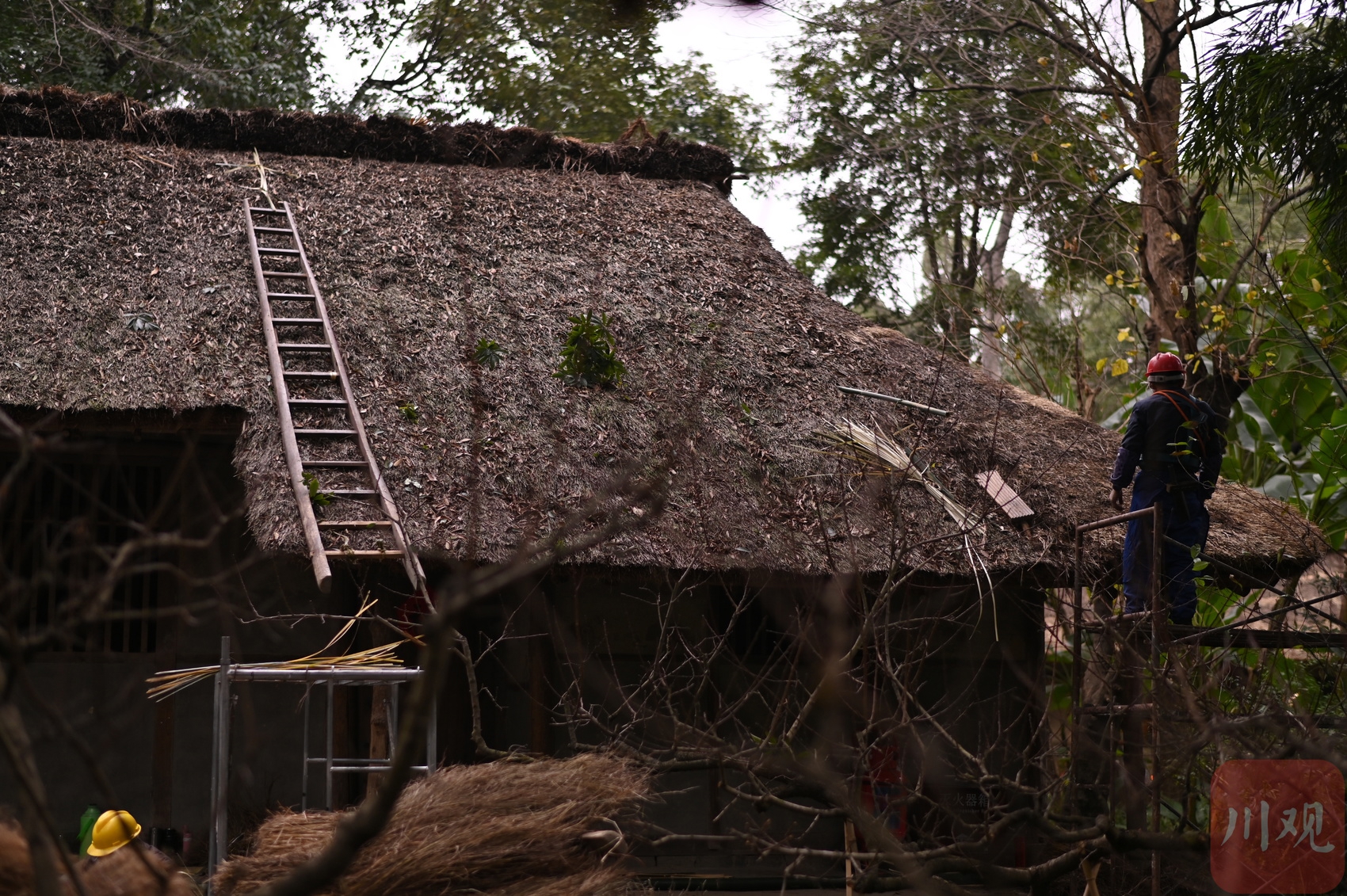 工人师傅用传统工具维修茅屋局部。