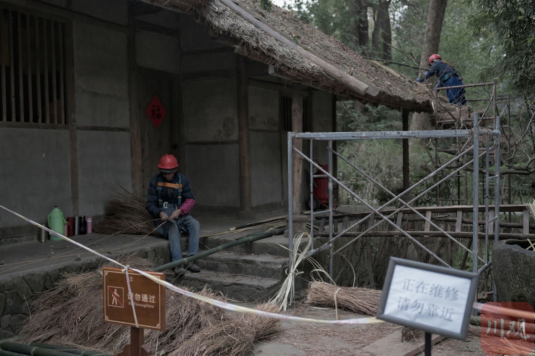 茅屋遵循传统的维护周期,约每十年大规模换草,每两年局部整修。本次点修主要针对茅草老化、局部渗漏等问题,全部采用自然晾晒的黄茅草,由经验丰富的传统“盖匠”团队以古法技艺施工。此次修缮涵盖茅屋故居、北邻、南邻三处区域,预计历时约一周,将对屋顶茅草进行更换并实施建筑局部维护。