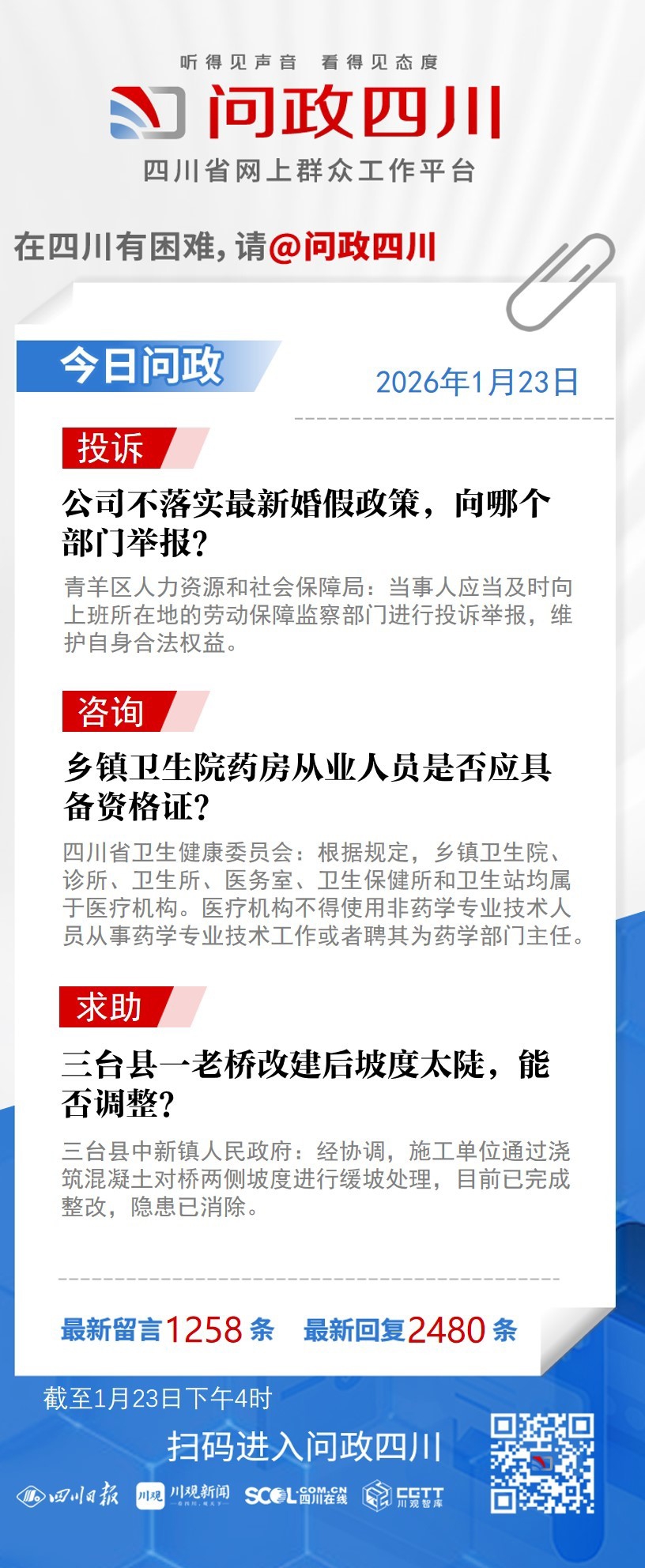 在四川有困难,找问政四川。如果您在四川遇到了操心事、烦心事、揪心事,请登录“四川省网上群众工作平台—问政四川”或拨打问政四川热线(028-96001)留言反映、求助或建议。我们将充分发挥平台的互动联系作用及舆论监督功能,第一时间传递民声,推动问题得以及时解决——听得见声音,看得见态度。