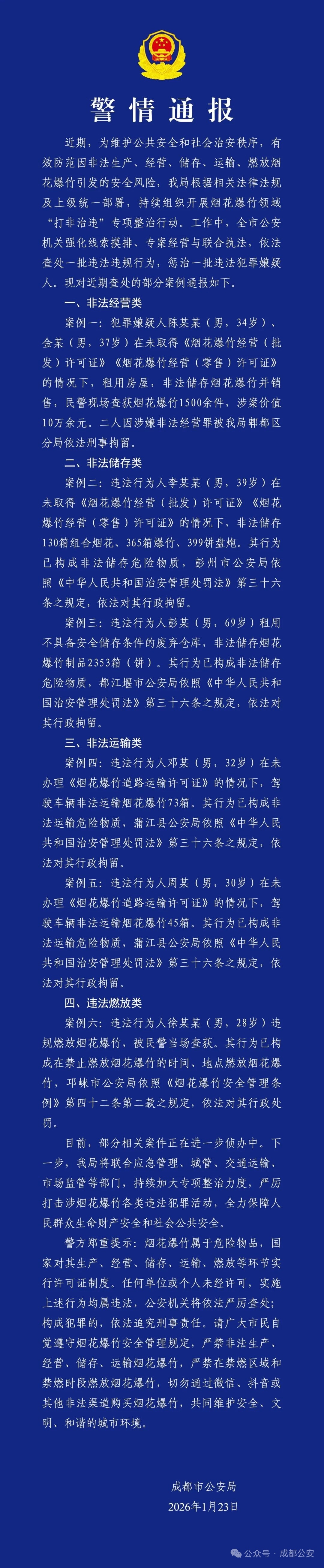 1月23日,成都市公安局通报了六起近期涉烟花爆竹典型案例。