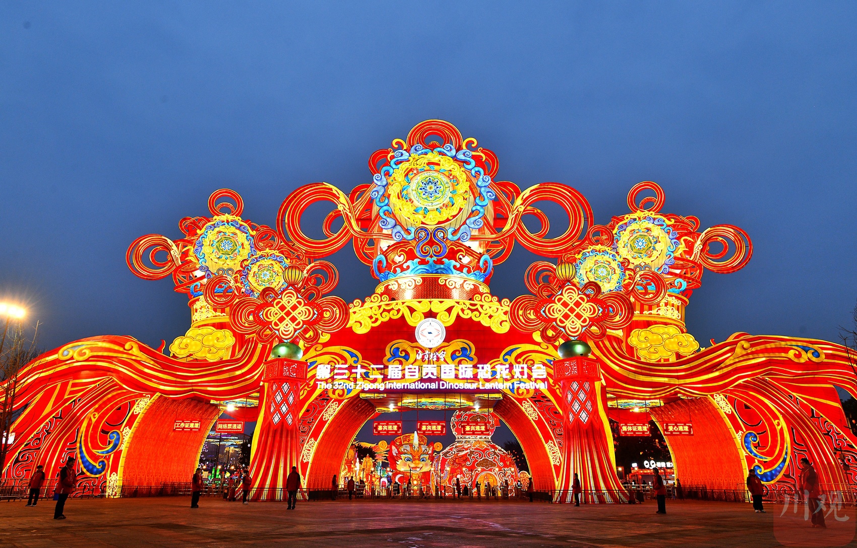 自贡国际恐龙灯会大门造型大气十足。