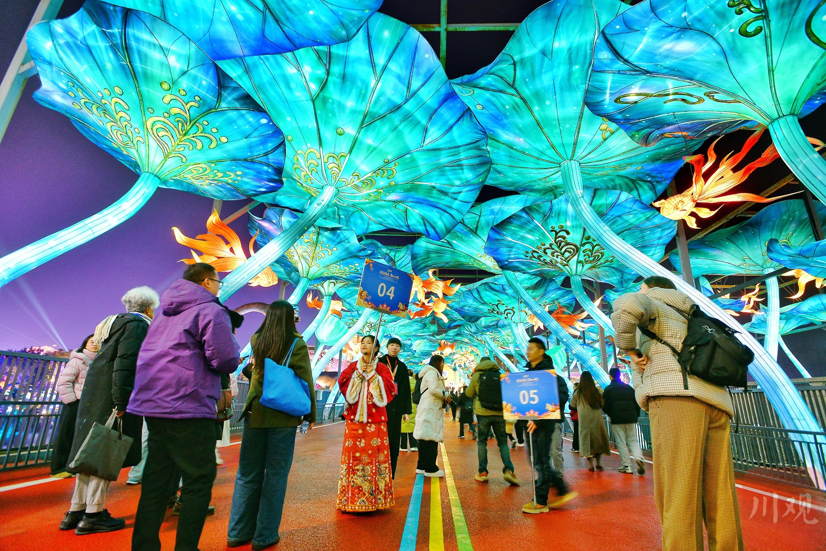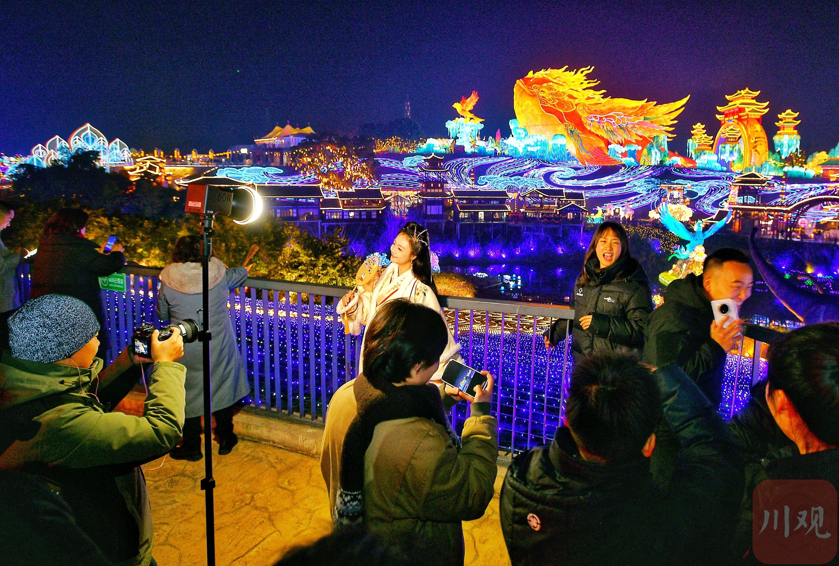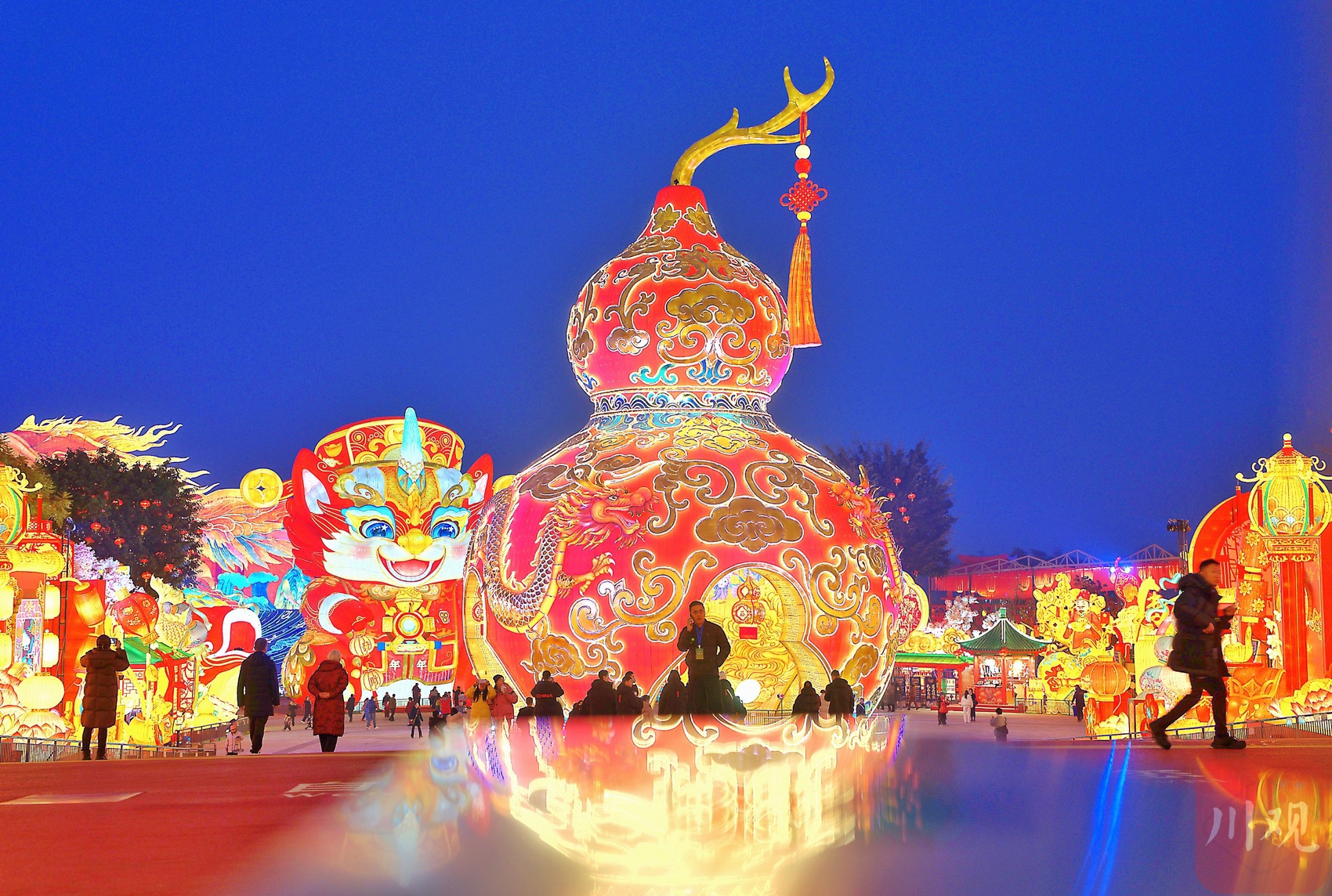 众多市民、游客在灯会里拍照打卡。