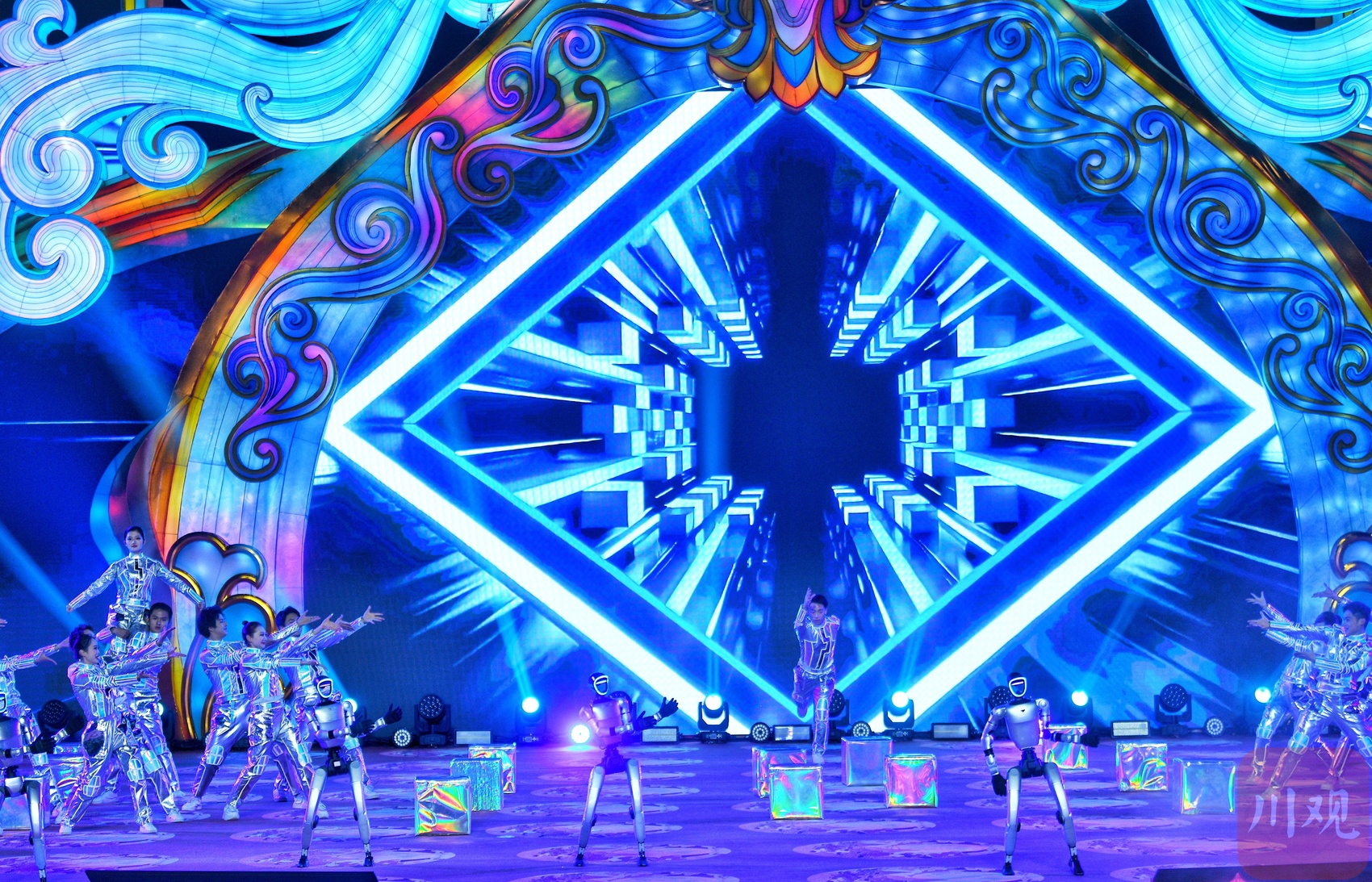 《筑梦未来》主题表演融合智能伞舞与人工智能机器人,现场气氛热烈。