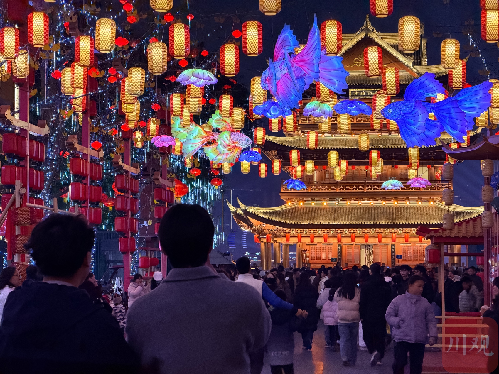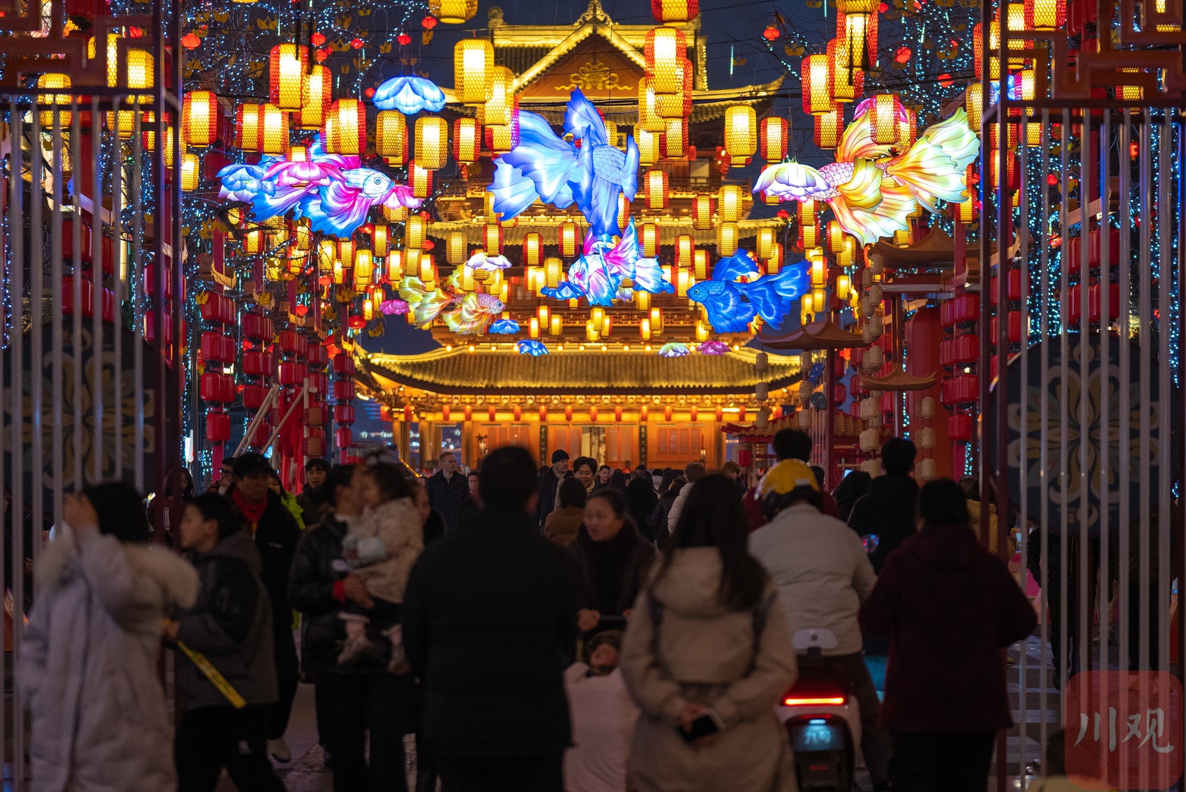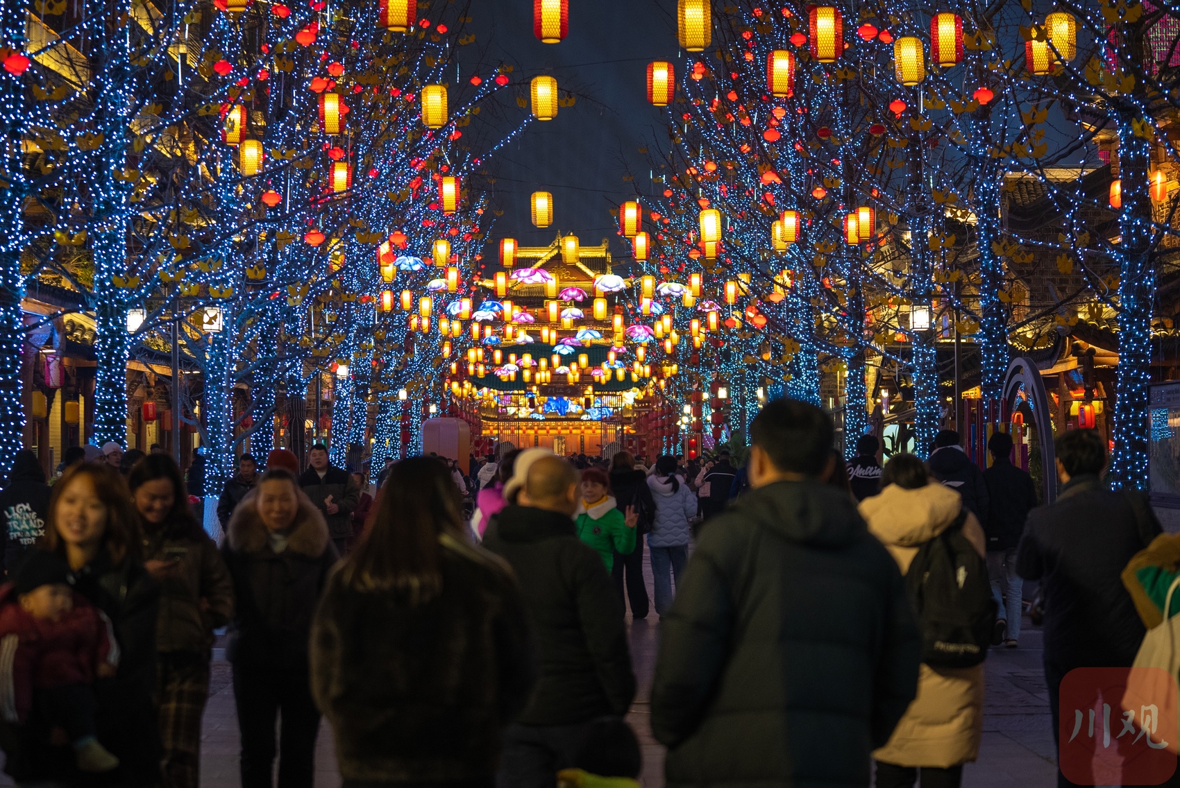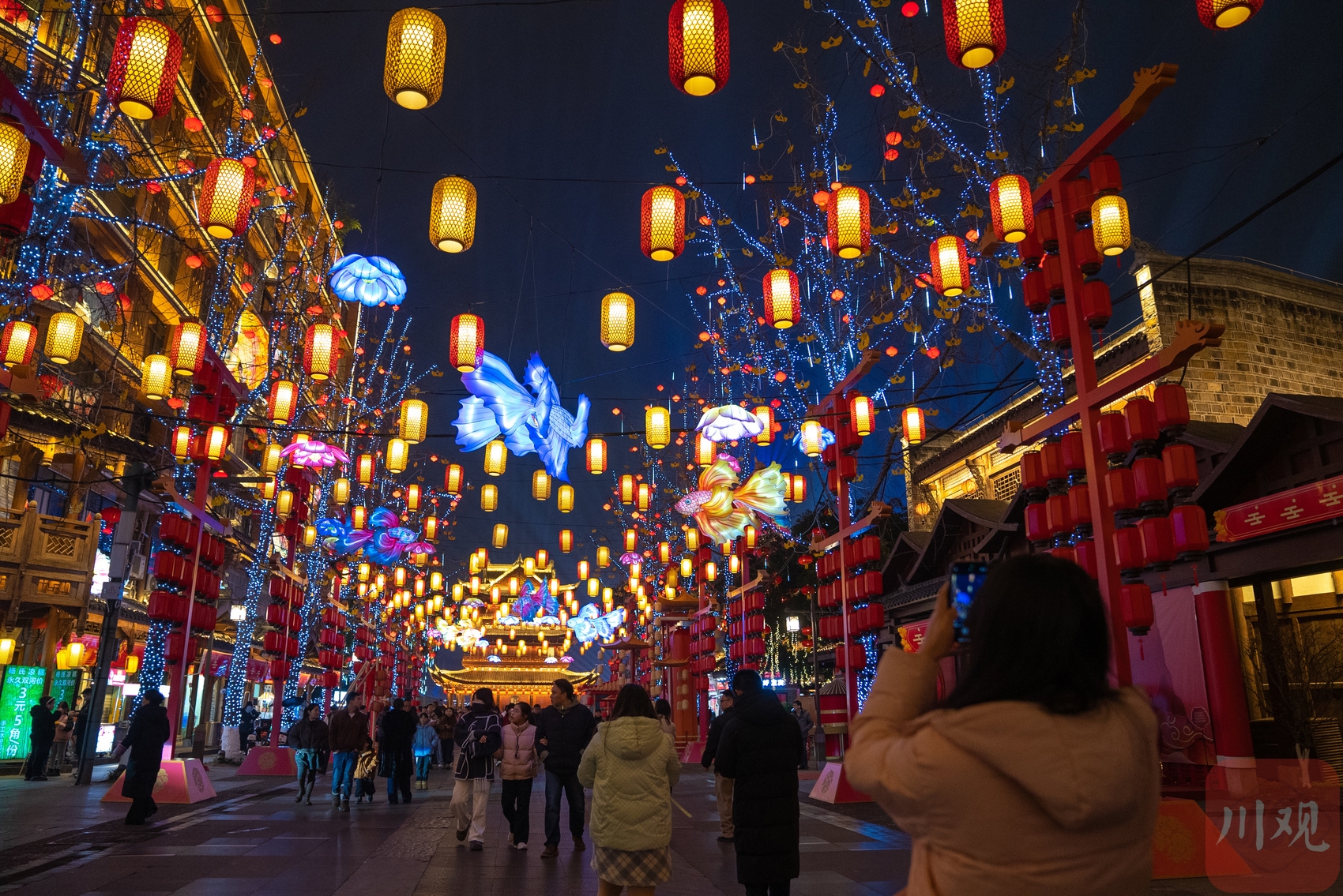 1月23日晚,宜宾市翠屏区合江街流光溢彩。约200米长的街道两旁,行道树上缀满串串小红灯笼,缠绕的灯带犹如星河洒落枝头。街道上方悬挂着大红灯笼、莲花灯与金鱼灯,光影交织,吸引众多市民游客驻足拍照,欢声笑语中洋溢着浓厚的年节气氛。