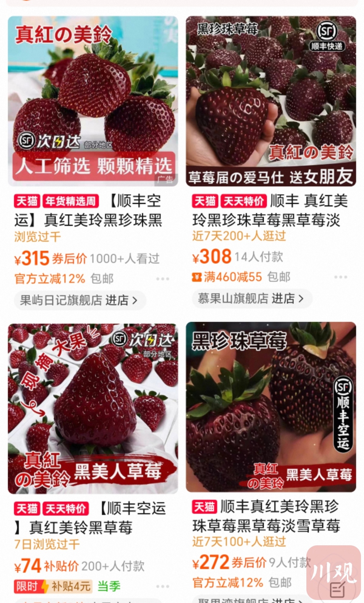 24日上午,记者打开“淘宝”搜索发现,不同规格的黑草莓售价不同,售价从75元到315元不等。盒马鲜生300克的黑草莓售价59.9元,页面显示本月已有6000多人下单。走访多个线下水果店、超市后,记者发现售卖的并不多。