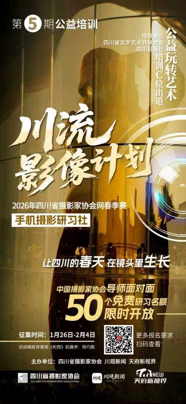 由四川省文学艺术界联合会、四川日报社作为指导单位的系列公益活动又放大招啦——川流影像计划四川省摄影家协会网2026春季赛手机摄影研习社报名征集正式启动!