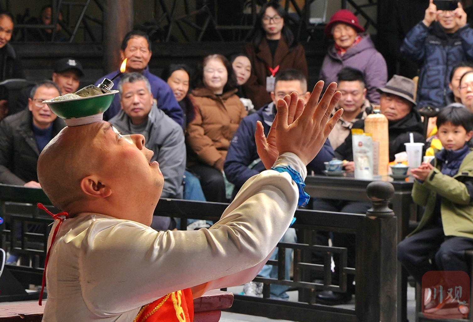 舞台上,川剧经典绝活轮番上演。滚灯演员头顶油灯、倒立下腰的高难动作令人屏息;神秘莫测的变脸吐火绝技将现场气氛推向高潮;“蹬技”与柔美的“水袖”舞动博得满堂喝彩。