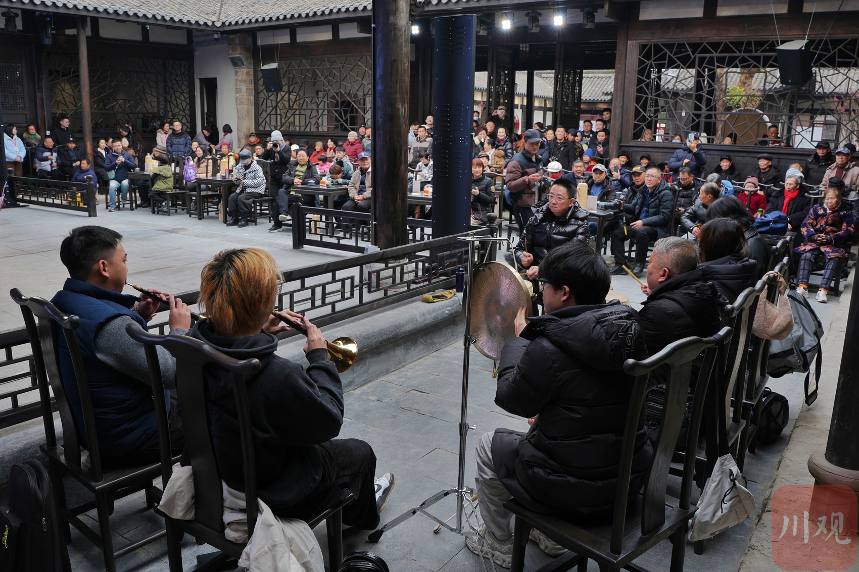 1月25日,成都青白江城厢镇中国川剧文化艺术中心的古戏台上,小锣、小鼓敲响、唢呐声高亢,吸引了众多本地居民与专程赶来的外省游客,同赴共享这场非遗文化盛宴。