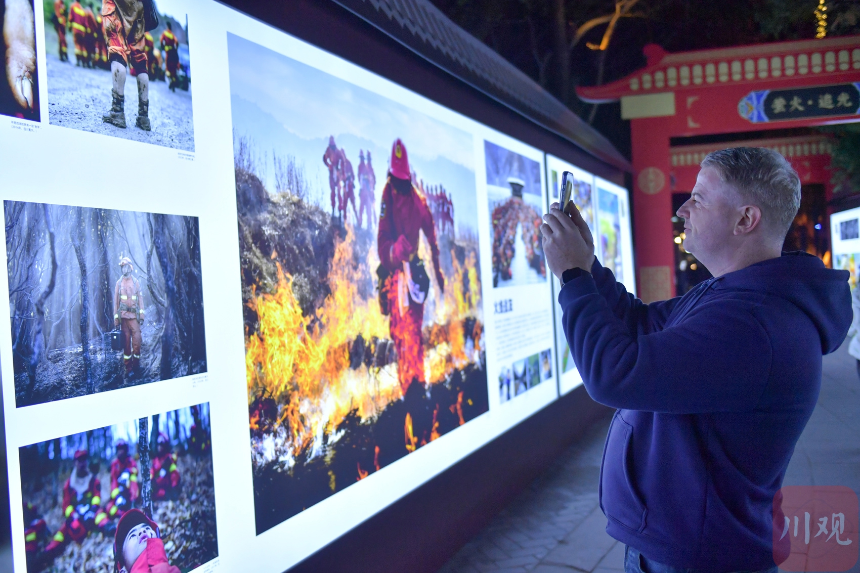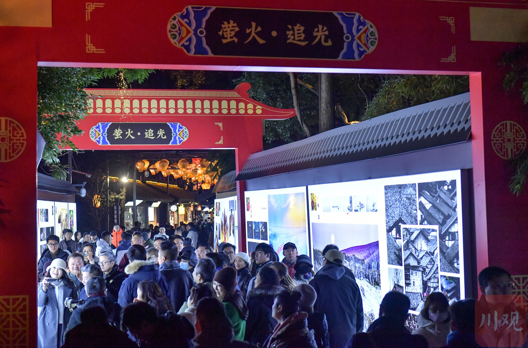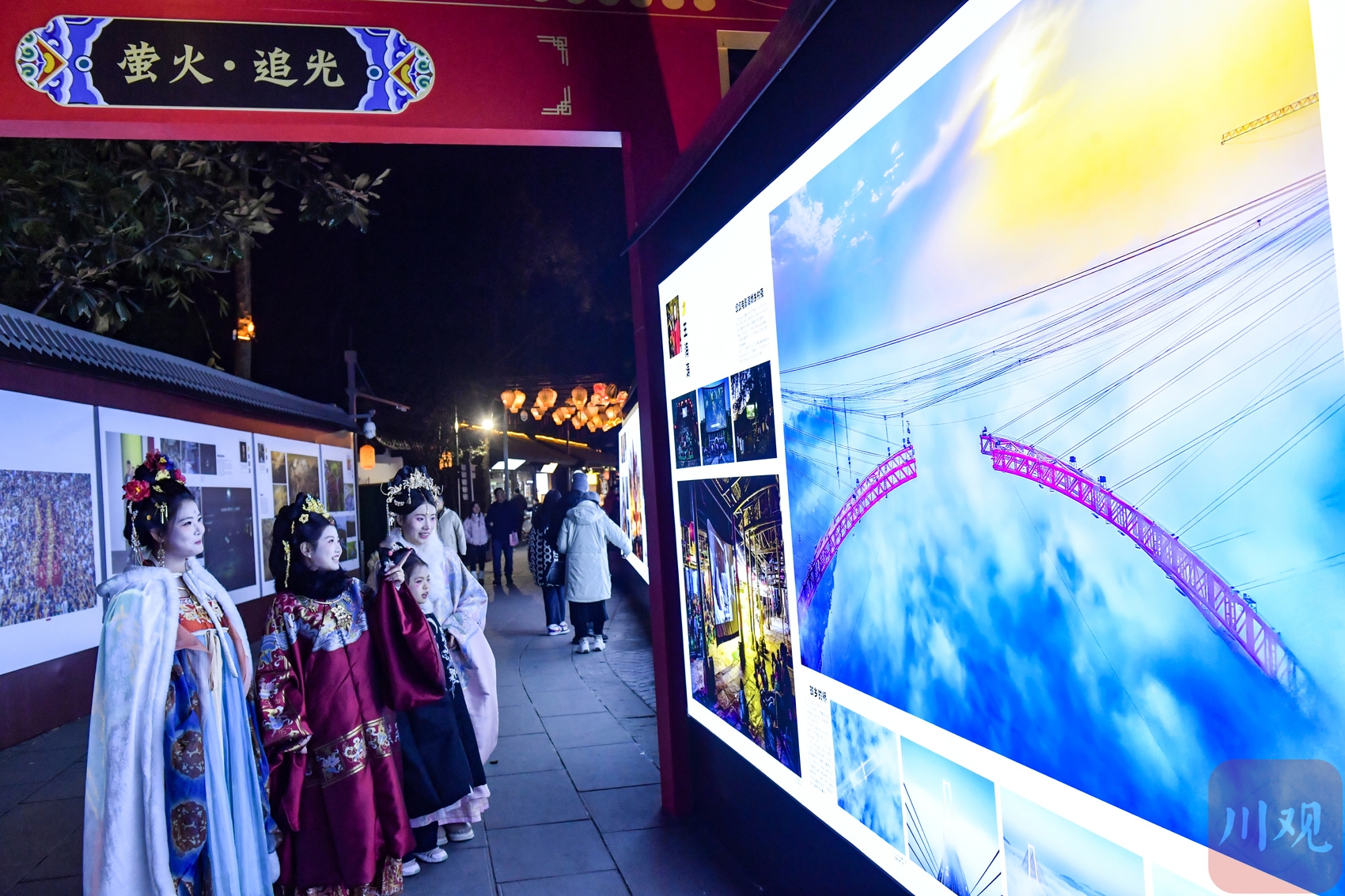 2026年1月25日晚,在成都锦里文化旅游街区,“萤火·追光”摄影展吸引市民或游客驻足欣赏。