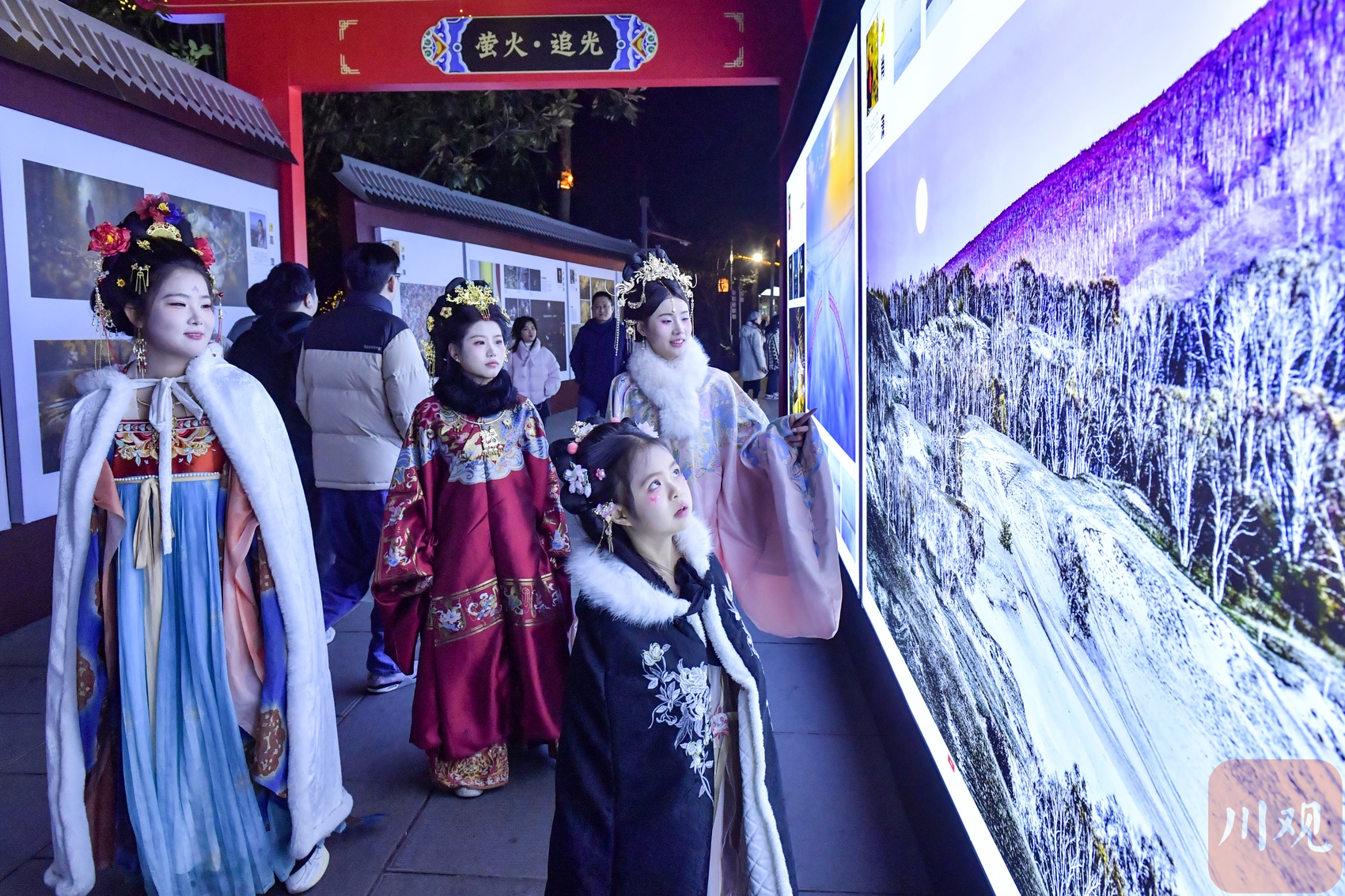 2026年1月25日晚,在成都锦里文化旅游街区,“萤火·追光”摄影展吸引游客驻足观赏,拍摄留念。