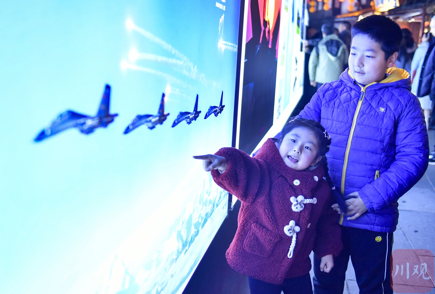 2026年1月25日晚,在成都锦里文化旅游街区,“萤火·追光”摄影展吸引两名小朋友驻足观看。