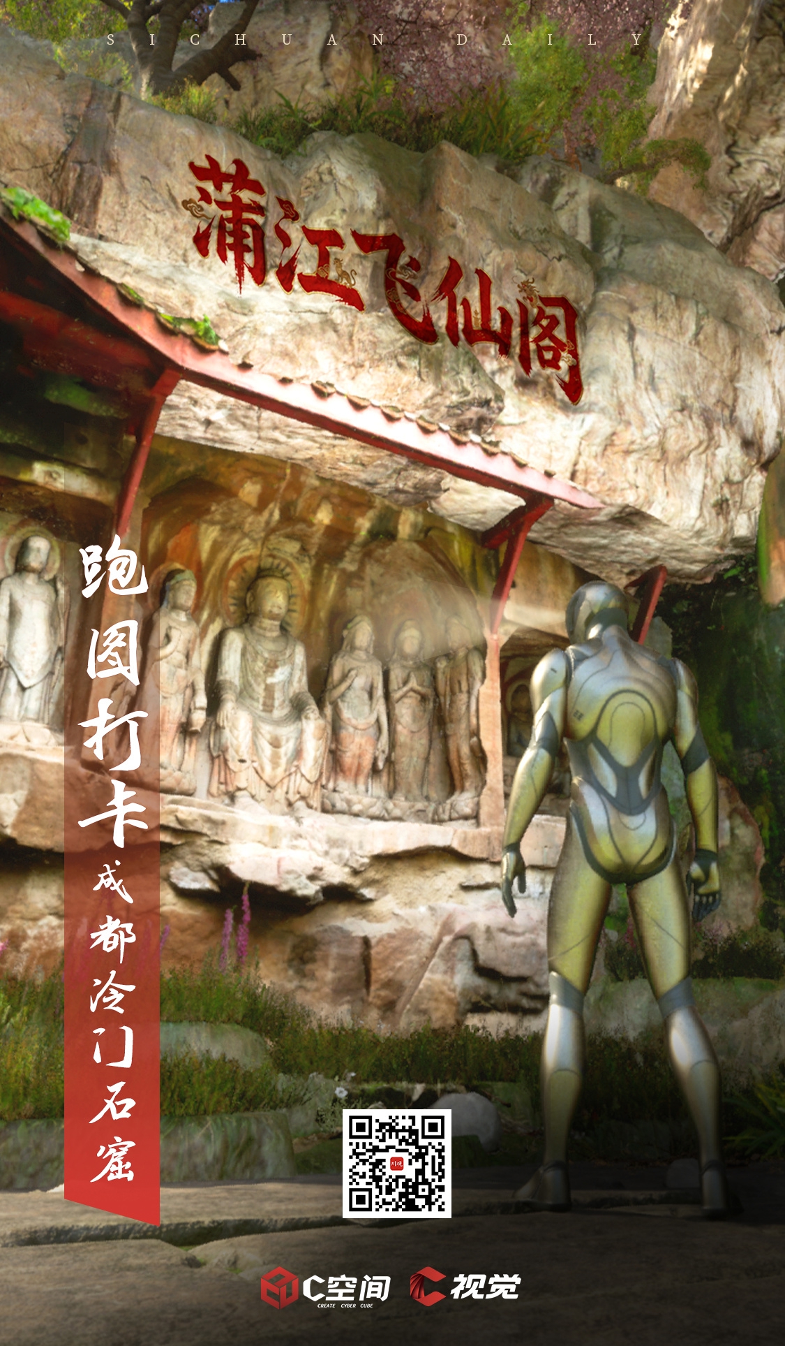 想不想用最酷的方式穿越回大唐?C空间栏目将成都蒲江飞仙阁石窟复刻于游戏世界,来跟随”小白人“一起跑图,赛博“打卡”来自千年前的石窟遗迹。