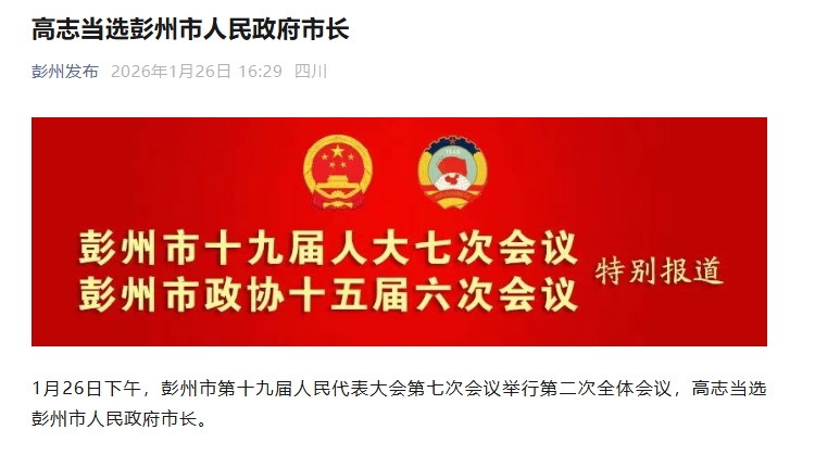 1月26日下午,彭州市第十九届人民代表大会第七次会议举行第二次全体会议,高志当选彭州市人民政府市长。