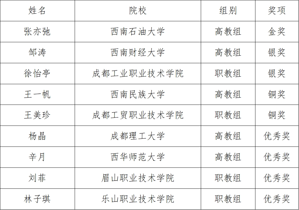 本次比赛以“筑梦青春志在四方,规划启航职引未来”为主题,聚焦职业发展与就业指导课程建设核心,通过课程建设汇报、教学展示、互动答辩三个环节,综合考察学校课程建设情况与教师教学能力水平,竞争尤为激烈。其中,西南石油大学张亦弛凭借扎实的课程建设功底、新颖的教学设计理念,在各环节中脱颖而出,以小组第1的成绩斩获金奖。具体获奖情况如下: