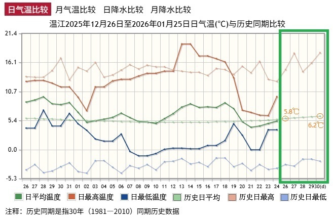 “五九”“六九”沿河看柳。进入“五九”天,意味着天气要转暖了。根据温江国家气象观测站的实况数据,我们可以清晰地看出这一趋势——未来几天,日平均气温从1月26日的5.8℃逐渐上升到月末的6.2℃。