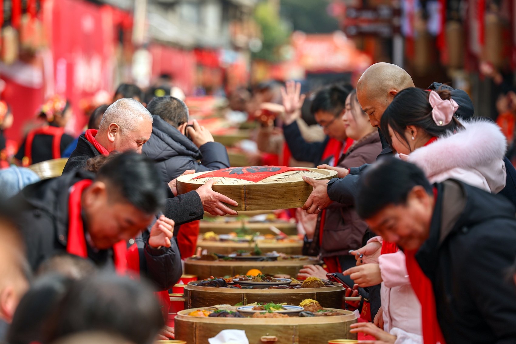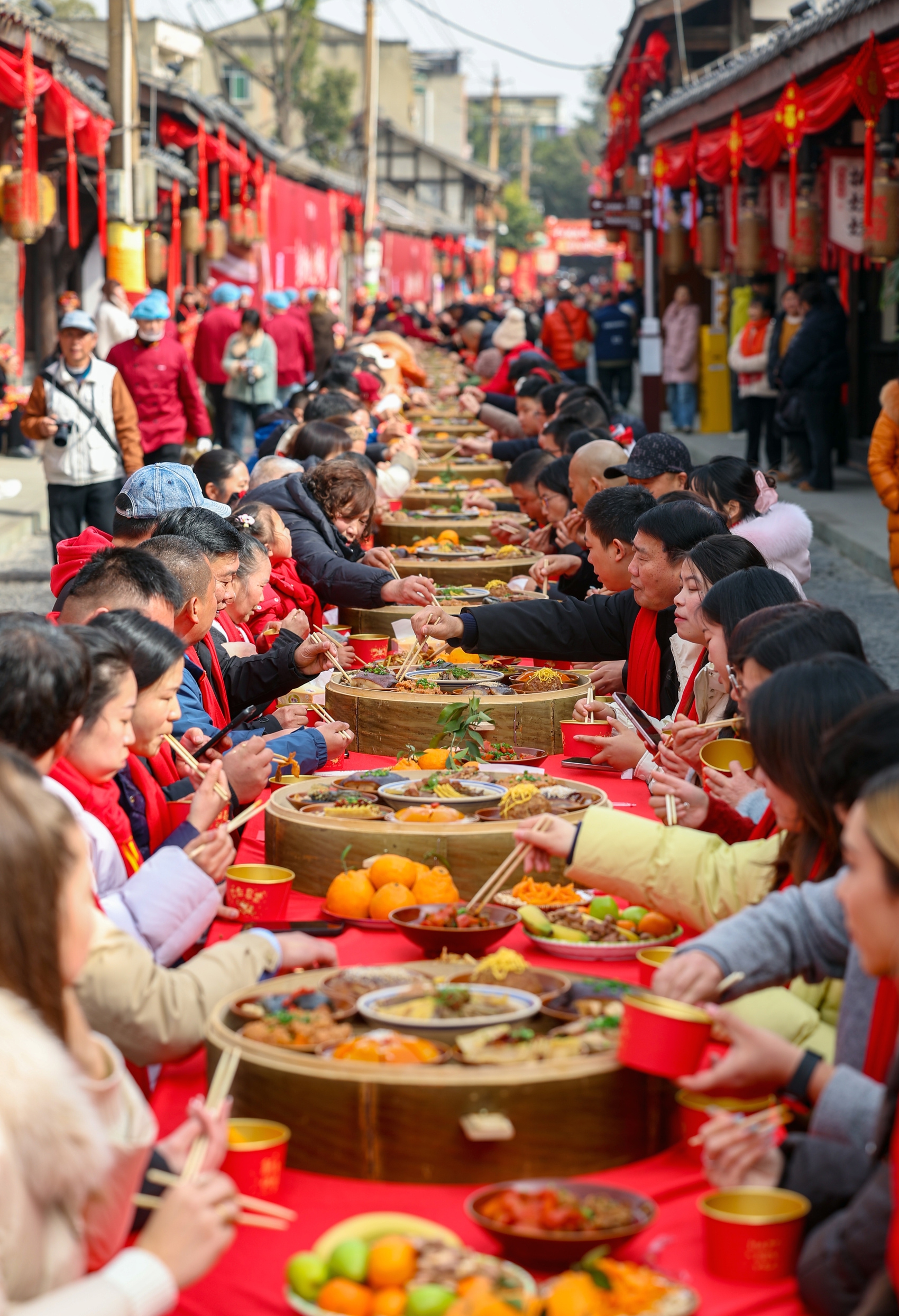 “过了腊八就是年。”1月26日是腊八节,成都市青白江区城厢古城西街上,张灯结彩,喜气洋洋,一场别开生面的百米长桌宴在这里热闹开席。