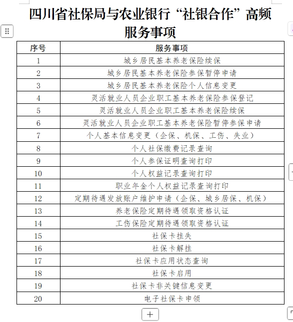 1月26日,记者从四川省人力资源和社会保障厅获悉,从今年1月起,四川省社保局携手中国农业银行四川省分行,通过全省1436个农业银行网点的3501台自助服务机,为群众提供养老保险待遇领取资格认证、个人社保缴费记录查询等20项高频服务事项。