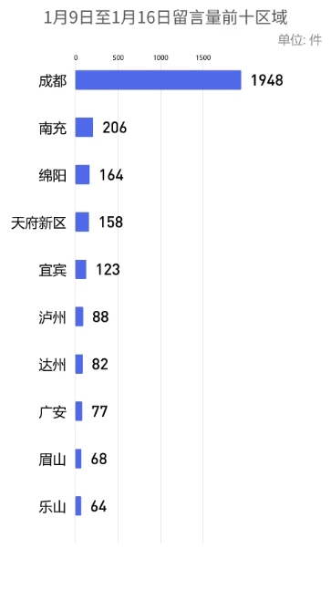 各市州及天府新区的留言量分别为:成都1948件、南充206件、绵阳164件、天府新区158件、宜宾123件、泸州88件、达州82件、广安77件、眉山68件、乐山64件、遂宁57件、凉山56件、德阳54件、内江53件、自贡47件、广元41件、巴中37件、资阳33件、甘孜25件、攀枝花24件、阿坝14件、雅安9件。