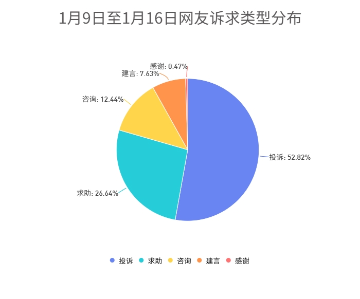 留言类型中投诉类最多,共2043件,占比52.82%;第二为求助类1030件,占比26.64%;第三为咨询类481件,占比12.44%。此外,建言类295件,感谢类18件。