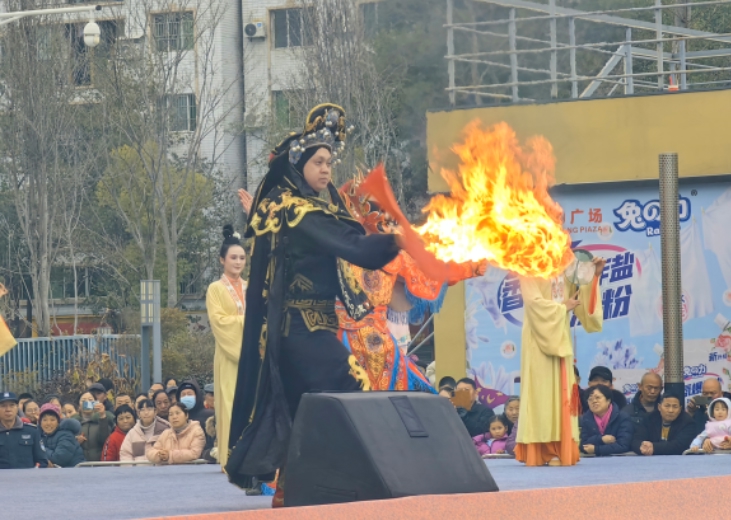 在绵阳市梓潼县演出现场,川剧演员表演喷火。主办方供图