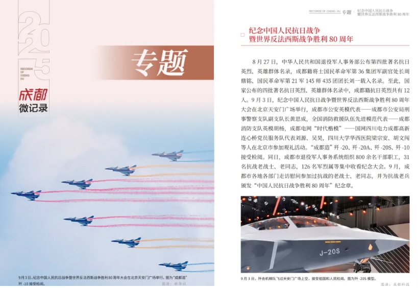 专题板块藏着城市的温度与力量。2025年,纪念中国人民抗日战争暨世界反法西斯战争胜利80周年大会在北京举行,12位成都籍英烈入选著名抗日英烈名录,“成都造”歼击机梯队接受检阅,家国情怀融入城市血脉;文商旅体深度融合,“夜游锦江”城南段启航、双层观光巴士上线,全国游泳锦标赛、ATP250成都公开赛等赛事燃动全城,第九届中国成都国际非物质文化遗产节让市民尽享文旅盛宴;“成都造”持续突破,《哪吒之魔童闹海》跻身全球影史票房前五,“通天晓”等机器人惊艳亮相,生物医药领域多款创新药获批上市;低空经济全产业链成型,86个应用场景、107条载人载物航线让“低空+”赋能民生;第12届世界运动会成功举办,中国代表团斩获64枚奖牌居双榜首位,成都获赞“高质量办赛”代名词。此外,20余位市民合力抬车救人、高温天爱心冰箱送清凉等暖心事,让城市微光汇聚成炬。