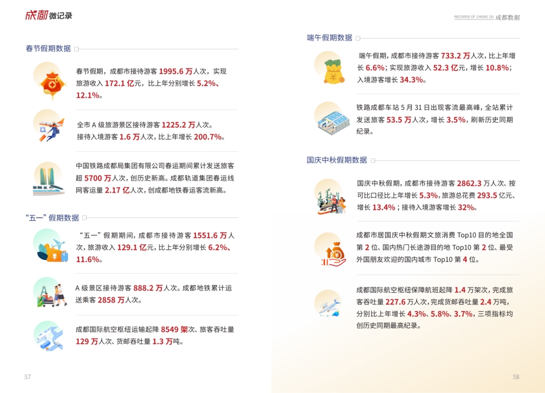 数据板块见证发展的坚实步伐。2025年,成都全年可观雪山天数达81天,刷新历史纪录;铁路运营总里程突破1000千米,形成“1环12射”铁路网;春节假期接待游客1995.6万人次,国庆中秋假期旅游总花费293.5亿元;离境退税商店达600家,国际航线增至82条;民营经济主体超390万户,居全国城市第2位;前8月引进大型演唱会77场,带动综合消费近40亿元,1—10月新落户首店710家,一组组硬核数据将看不见的幸福转化为可感可触的民生底色。