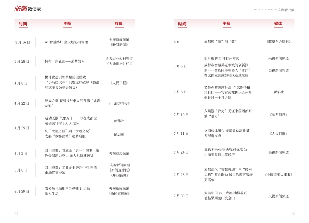 成都微记逐月记录城市发展的新鲜惊喜。1月成都至深圳夜间动卧开行,3月西部首个机器人公园开园,5月地铁驿站新增20余项公共服务,9月湔江堰获评世界灌溉工程遗产,12月国家主席习近平在都江堰同法国总统马克龙友好交流……每月上新的城市大事与热搜热点,串联起全年不重样的幸福轨迹。