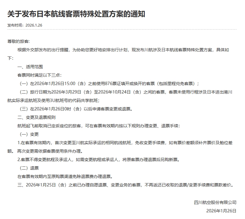 日前,国航、南航、东航,以及本地的川航等航空公司发布公告,针对1月26日12时前已购买、旅行日期为3月29日至10月24日的上述航空公司日本航线进出港航班客票,可办理免费退改手续。山航、厦航、上航等航司也同步发布类似公告。
