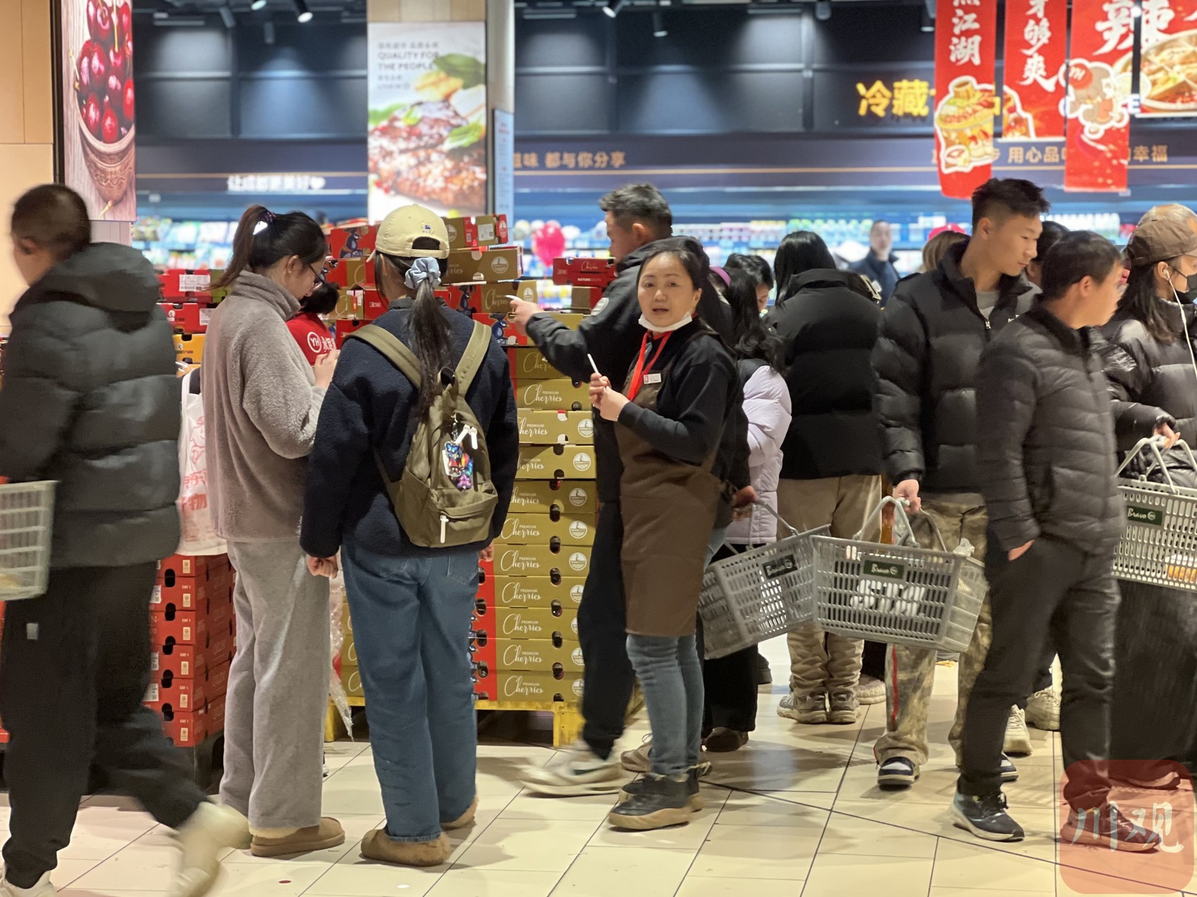“扫码领券!2J车厘子90元5斤。”1月24日晚,永辉超市(科华王府井店)水果区域,在工作人员的卖力吆喝下,不少消费者凑上前了解。