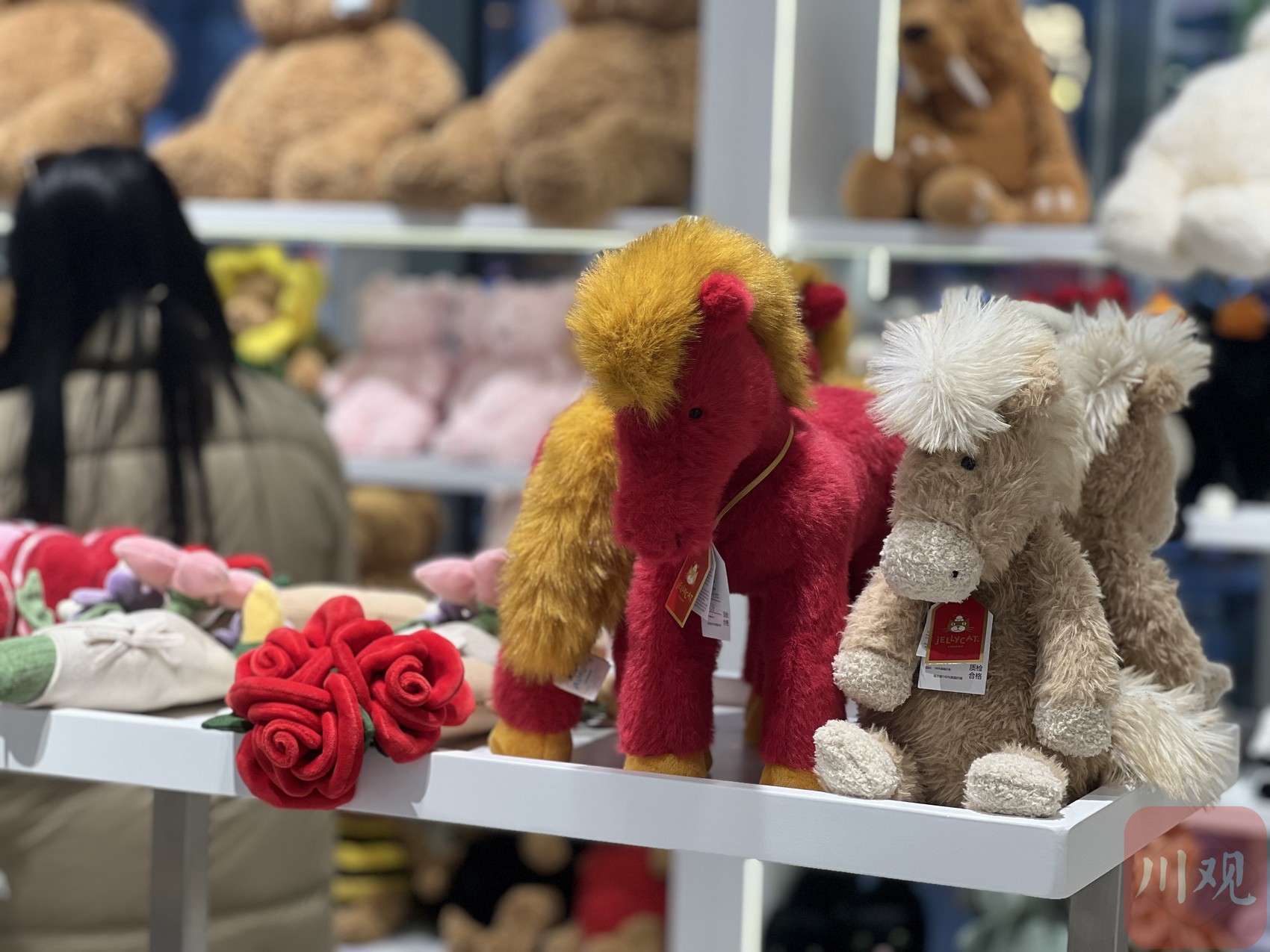 “这是我们新年系列——赤焰马玩偶,共有2个款式,销量都还不错。”位于东郊记忆的一家主卖Jellycat的潮玩店铺里,店长廖萍正向顾客推销店里的新年特别款,“今年是马年,春节假期也挨着情人节,因此推出了以玫瑰花、马为形象的毛绒玩具,受到了年轻消费群体的喜爱。”