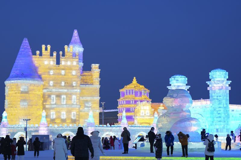 寒冬时节,哈尔滨冰雪大世界园区流光溢彩,吸引了来自天南海北的游客观赏游玩,畅享冰情雪趣。