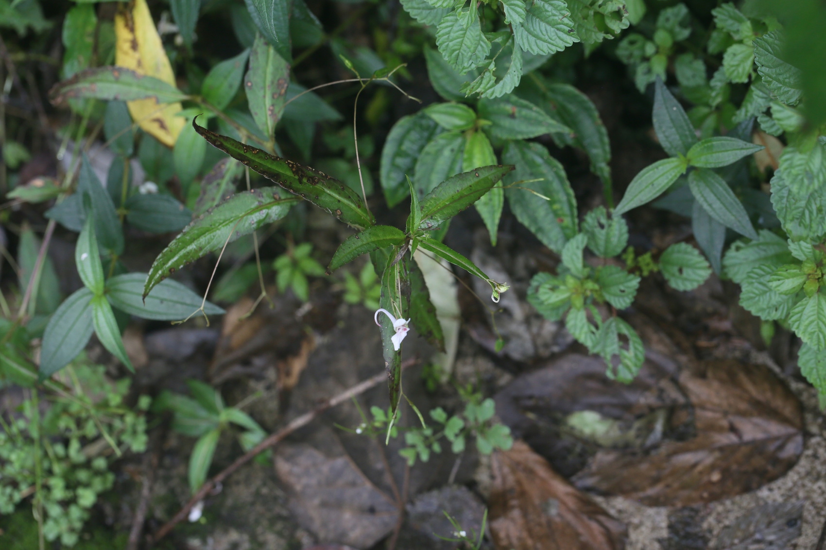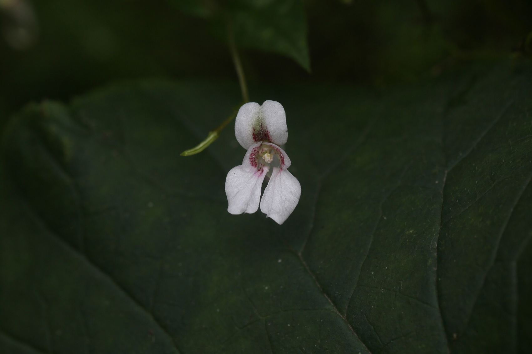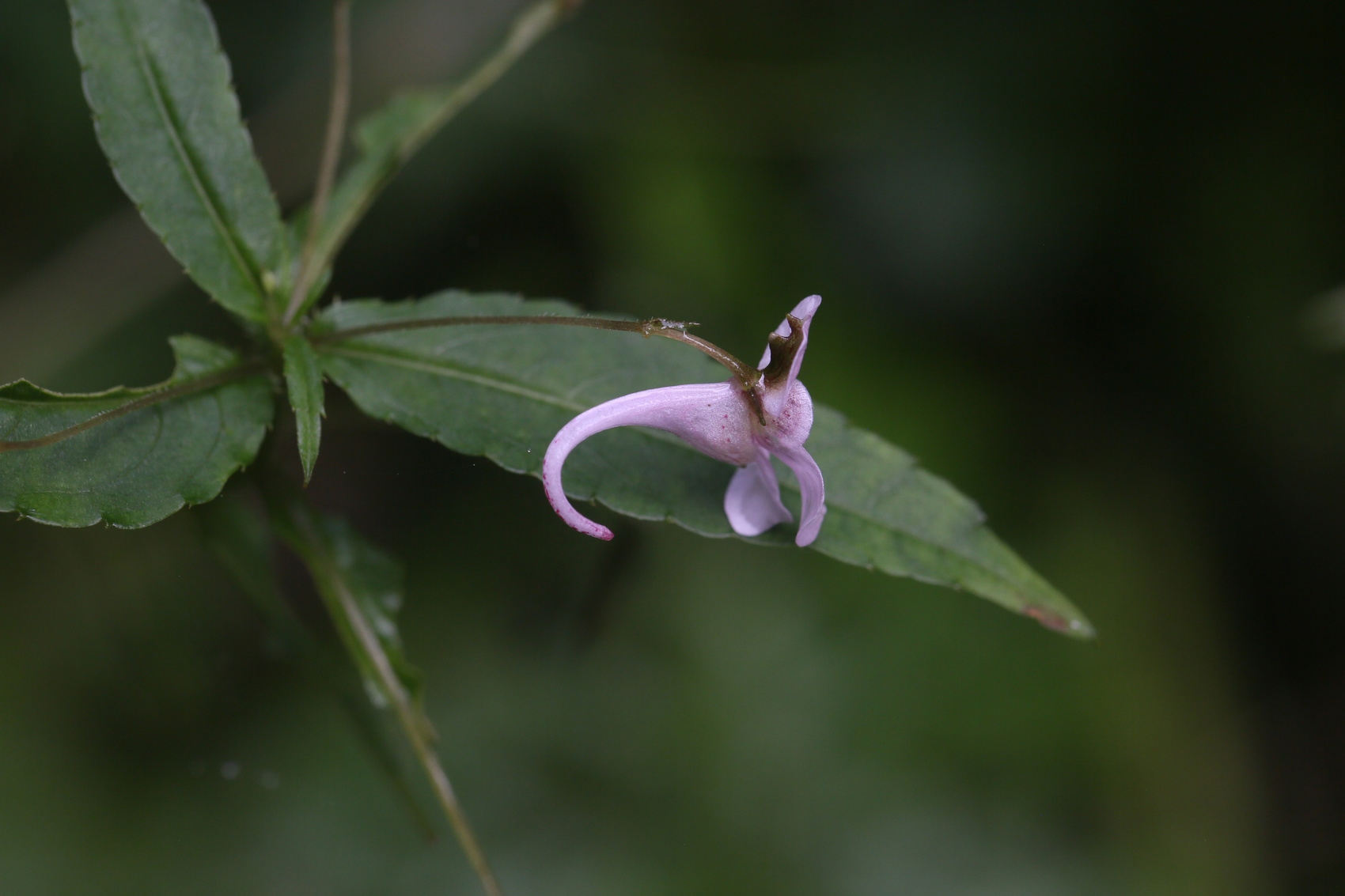 从照片上看,龙苍沟凤仙花在形态上与弯距凤仙花相似。它的叶片边缘具浅圆状锯齿、叶片背面常呈紫红色、花序通常具2朵花。与此同时,该新物种的花长1.2–1.8厘米,旗瓣直径6–8毫米,其侧生萼片等部分还具有系列特征,这些特点使它区别于其他物种。