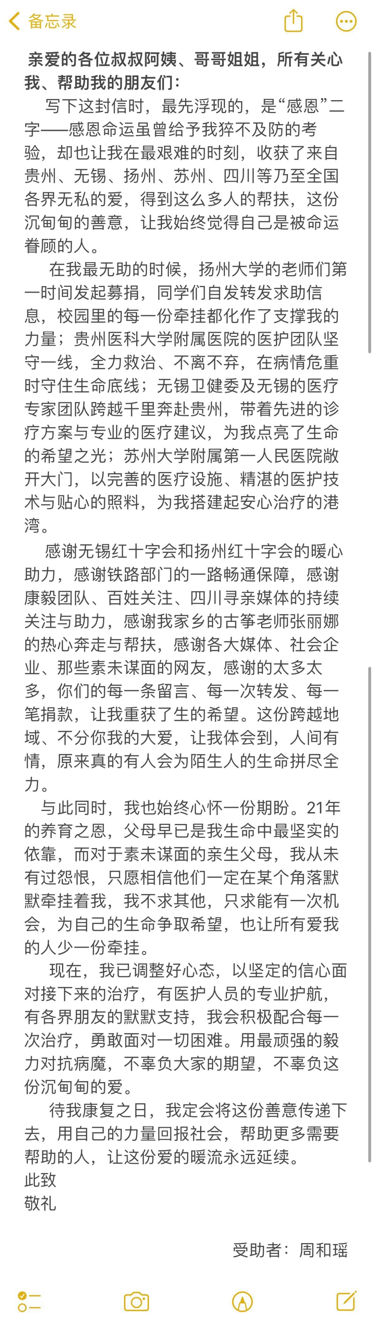 1月27日,病床上的周和瑶给所有关心她的人写了一封信。“对于素未谋面的亲生父母,我从未有过怨恨,只愿相信他们一定在某个角落默默牵挂着我,我不求其他,只求能有一次机会,为自己的生命争取希望。”她在信中表示。
