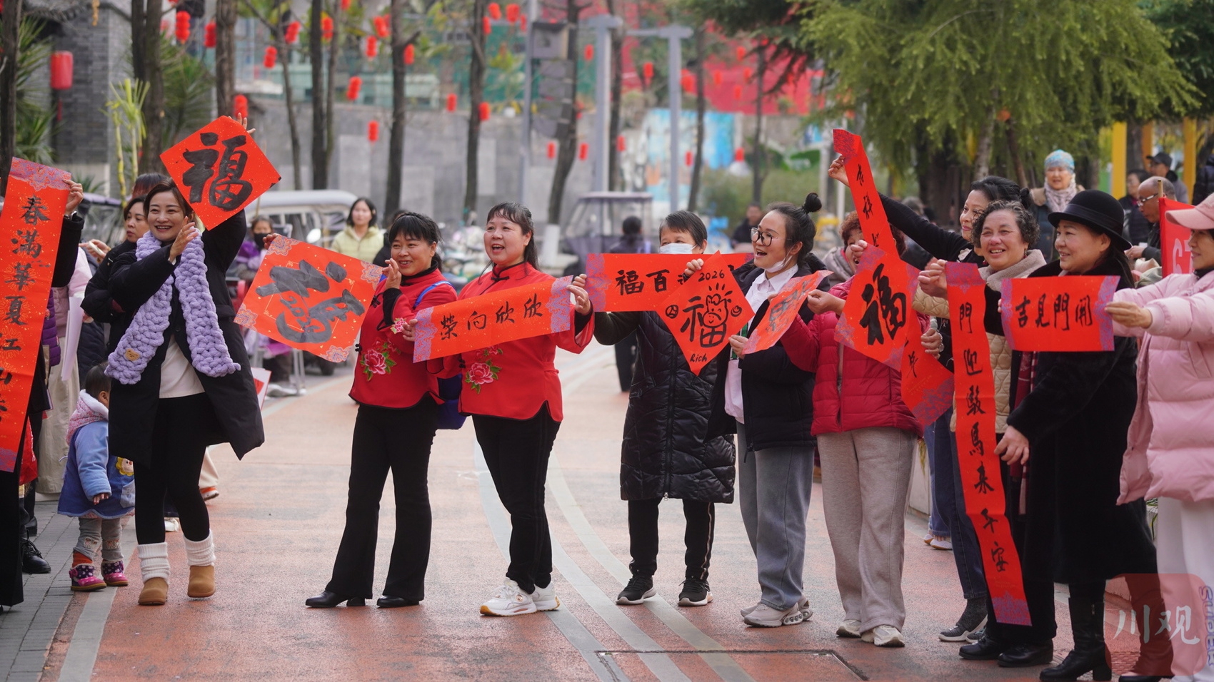 街头,居民们手持刚领到的手写“福”字与春联,在挂满红灯笼的街道上合影。