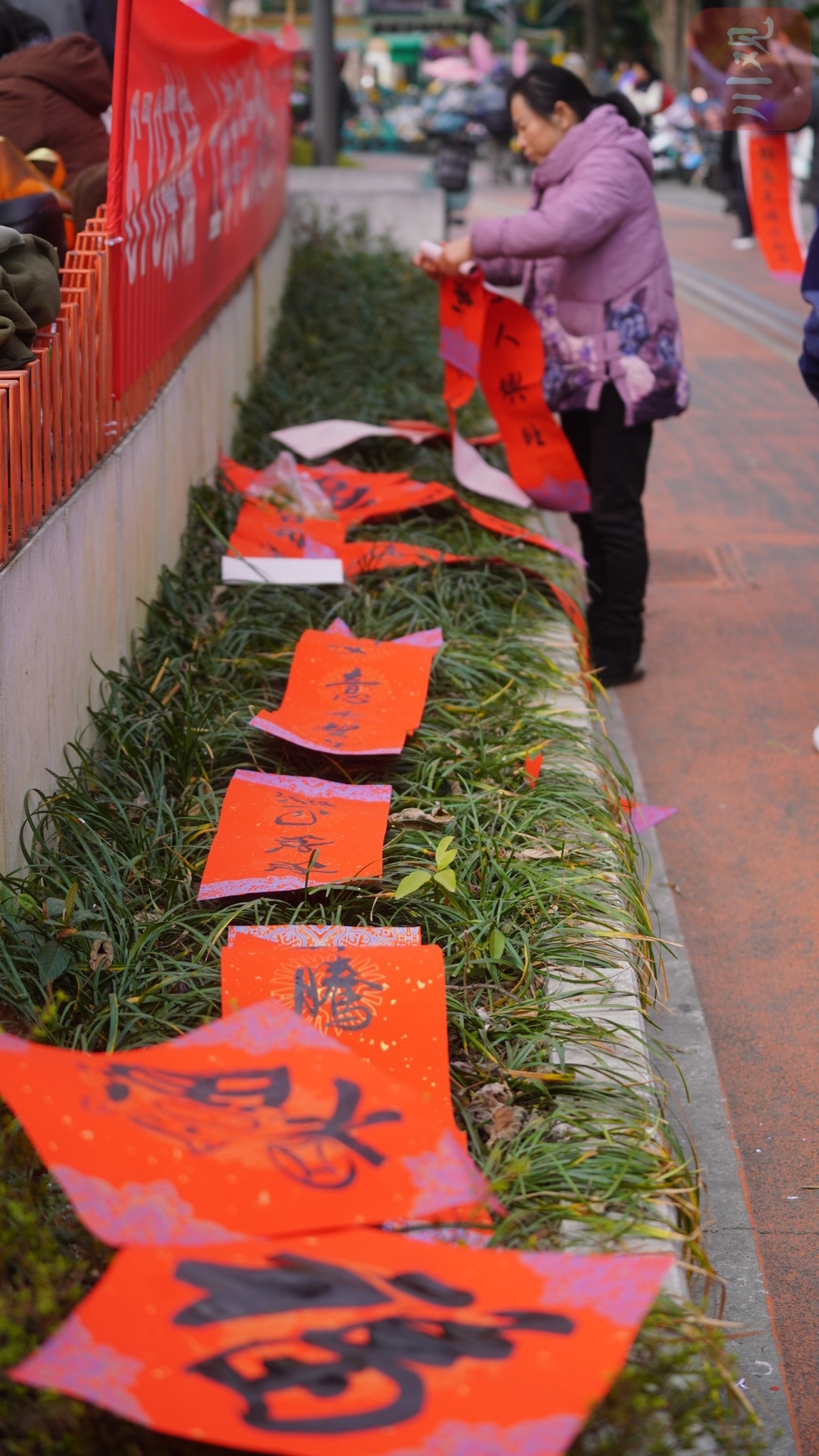 刚写好的“福”字和春联,一张张铺在路边的绿植上晾晒,是街头独有的年味风景。