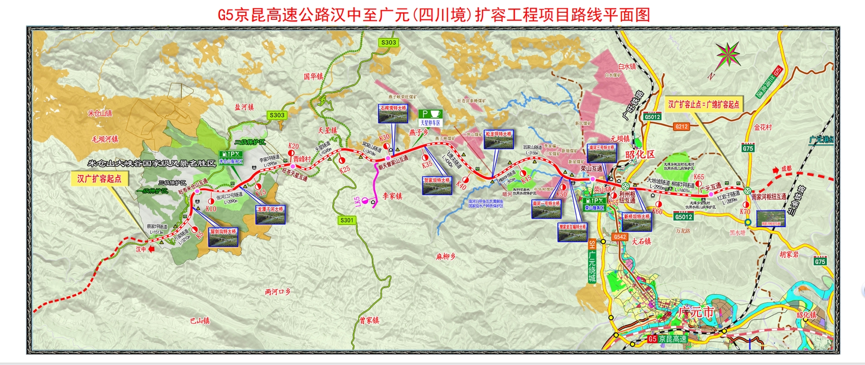 汉广绵高速扩容项目全长约195公里,起于广元市旺苍县川陕交界处,止于绵阳市魏城镇,接G5京昆高速公路绵阳至成都段扩容项目,总投资544.6亿元,是四川省内投资最大的高速公路扩容项目。作为国家“十纵十横”综合运输大通道首都放射线G5京昆高速的关键段落,也是四川省北上出川的核心通道,项目建成后,从成都至汉中的行车时间将由6小时缩短至4.5小时,有效提升现有京昆高速的通行能力。